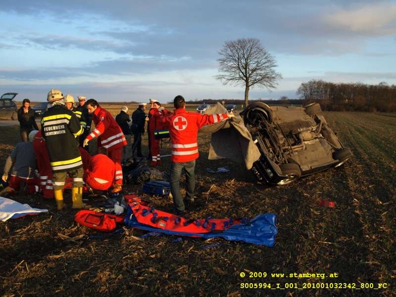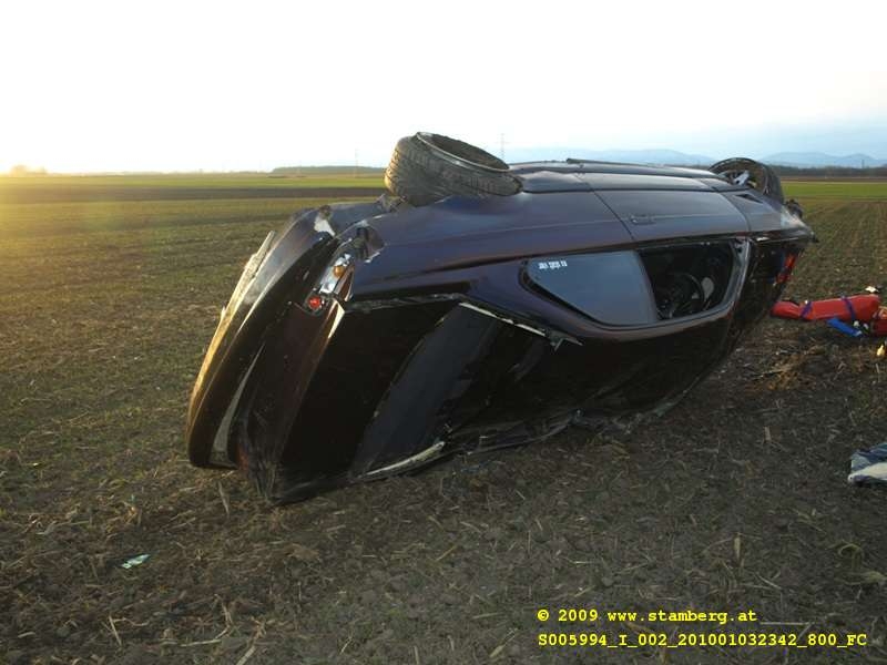 lag seitlich schwer beschädigt im Feld. Zwei Verletzte Personen lagen neben