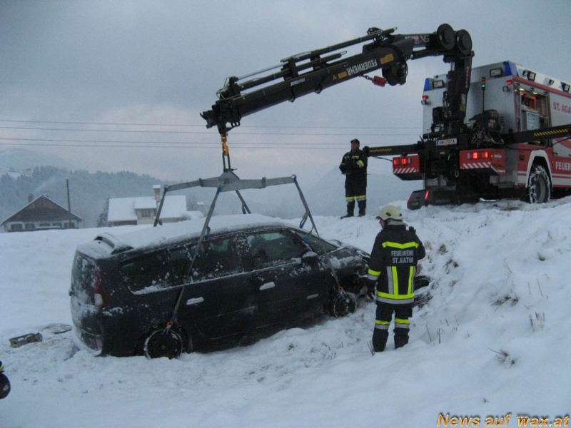 Zur Bergung des Fahrzeuges wurde die FF St. Agatha alarmiert. Mittel Kran