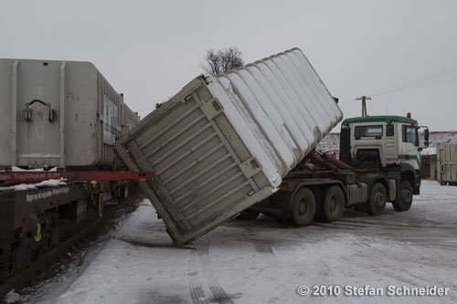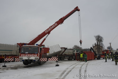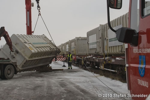 Beim Beladen eines Güterwaggons mit einem Container rutschte dieser seitlich ab und drohte samt LKW umzustürzen (wie auch vor ca. fünf Jahren). Der Container wog ca. 18 t und war voll mit Müll beladen. Da wir mit den uns zur Verfügung stehenden Mitteln den Container aber nicht bergen konnten, wurde über Florian Baden das 50 to