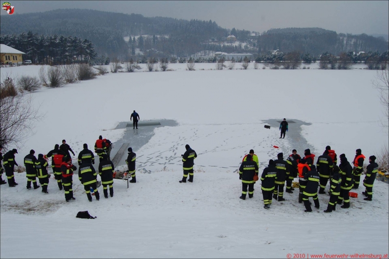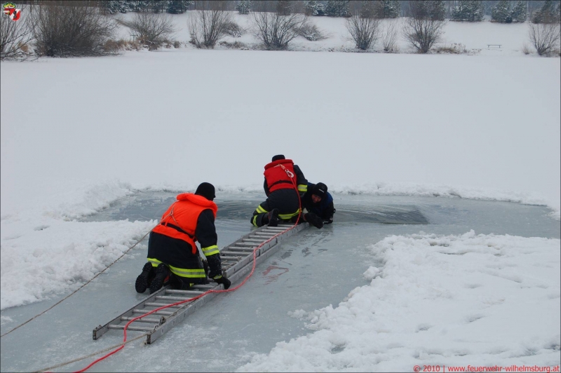 Im Eis eingebrochene Personen benötigen schnellstmögliche Hilfe - Aus diesem Grund haben sich Helfer der Feuerwehren Wilhelmsburg-Stadt, St.Pölten-St.Georgen, St.Pölten-Ochsenburg sowie von den Rettungsorganisationen ASBÖ Wilhelmsburg und RK St.Pölten samstags vormittags im Feuerwehrhaus Wilhelmsburg versammelt.