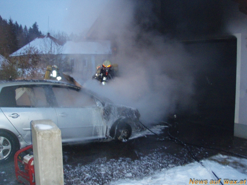 Um 16:37 Uhr wurden die Feuerwehren Thalsdorf, Launsdorf, Pölling, St.Sebastian und St.Veit/Glan alarmiert. Beim Eintreffen der ersten Einsatzkräfte wurde ein brennendes Fahrzeug in der Garage vorgefunden. Der PKW stand im Bereich der Motorraumes in Vollbrand, die Flammen hatten auch bereits auf den Innenraum sowie auf andere Gegenstände, die sich in der Garage befanden, übergegriffen. Mehrere Fenster waren durch die Hitze geborsten. Immer wieder war ein Knallen zu hören, Teile wurden durch die Luft geschleudert.