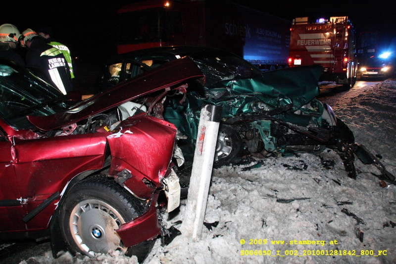 Ein BMW mit Hollabrunner Kennzeichen und ein Chevrolet Kalos krachten auf der B14 in einem Bereich wo der Schnee durch den starken Wind auf die Fahrbahn geweht wurde, frontal aufeinander. Beide Lenker wurden unbestimmten Grades verletzt und vom Rettungsdienst ins Spital gebracht. Die Feuerwehr musste in weiterer Folge die fahrzeuge bergen, die fahrbahn von den Wrackteilen befreien und die ausgeflossenen Treibstoffe binden. Die B14 war über zwie Stunden gesperrt.