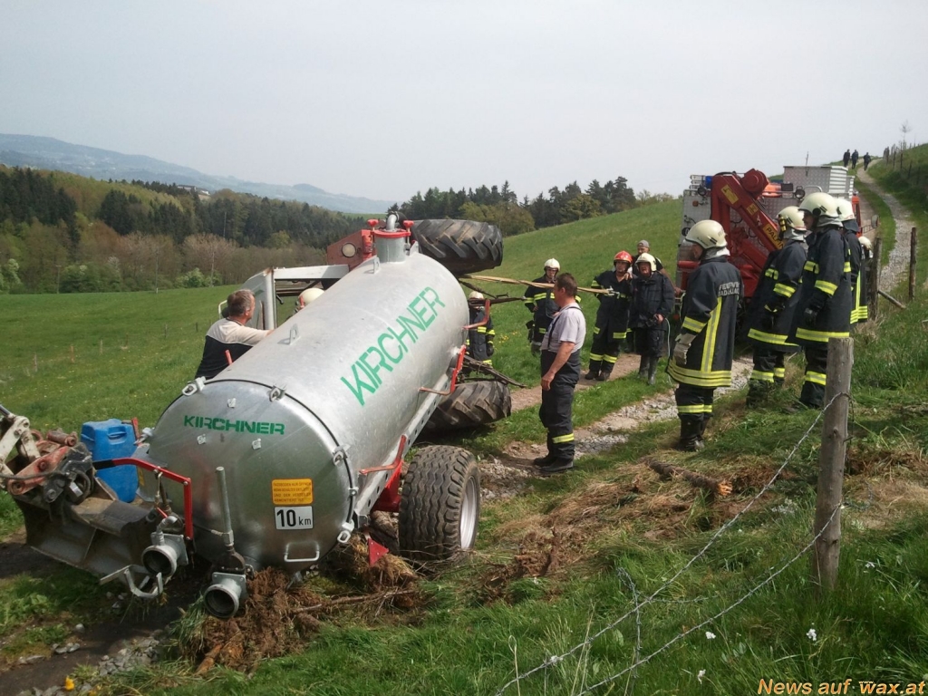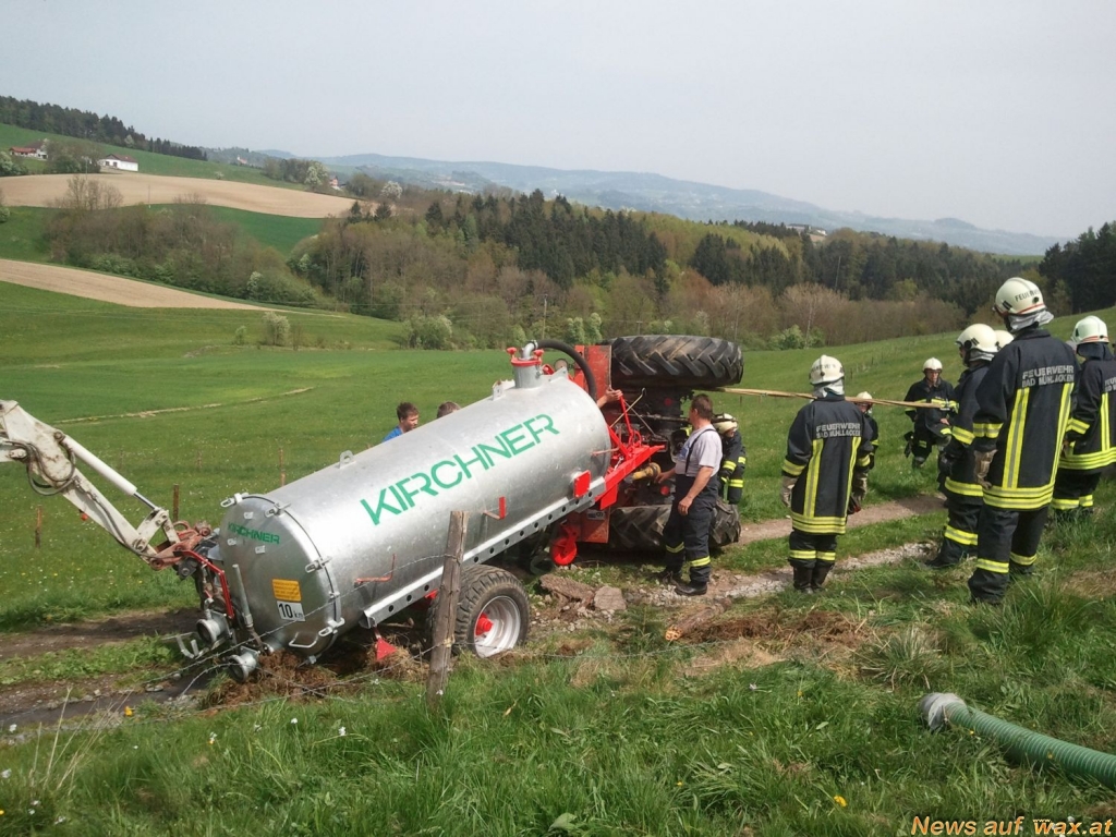 Ein Traktor war mit einem Güllefass auf einer steilen Wiese abgerutscht und umgestürzt. Der Fahrer konnte sich selbst befreien - er wurde bei der Bergung seines Fahrzeugs von den angerückten Feuerwehrkräfte unterstützt. Mit der Seilwinde des Rüstfahrzeuges der FF Bad Mühllacken wurde der Traktor wieder auf die Räder gestellt. Nach einer Stunde war der Einsatz für die 16 ausgerückten Mitglieder der FF Bad Mühllacken beendet und es konnte ins Feuerwehrhaus eingerückt werden.