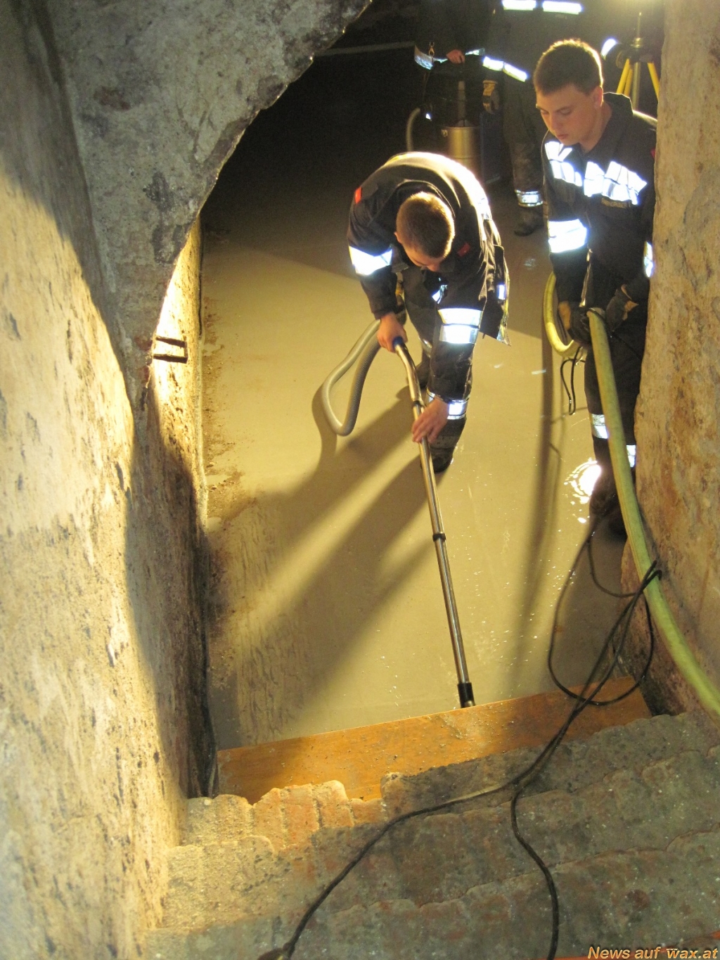 Der Einsatzleiter forderte umgehend das Versorgungsfahrzeug mit dem Rollcontainersystem für Wasserschäden nach und als Sofortmaßnahme wurde begonnen den Keller auszupumpen. Da der Zulauf durch die langen Sickerzeiten des Gewölbes jedoch ungebrochen war, wurde entschieden den Einsatz vorerst abzubrechen und am Abend weiterzuarbeiten.