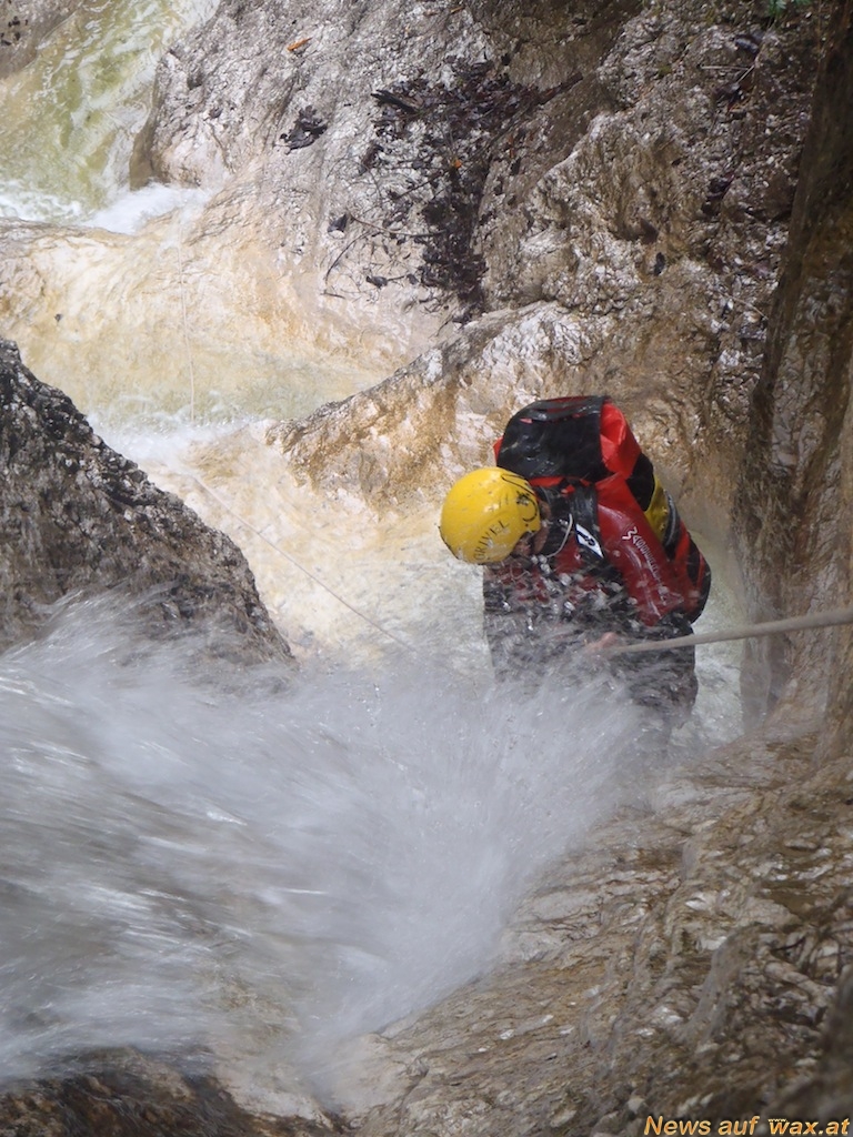 Nach der Anreise aller TeilnehmerInnen und der ersten Theorievorträge am Dienstagabend ging es am Mittwochvormittag gleich mit Knotenkunde und der Theorie zum Erstellen einer Seilfähre weiter. Im Anschluss wurden die bereits vorhandenen Praxiskenntnisse der TeilnehmerInnen überprüft und die ersten Schritte im Wildwasser gemacht. Ein weiterer Tagesordnungspunkt war das Abseilen von der Gosauzwang-Brücke.