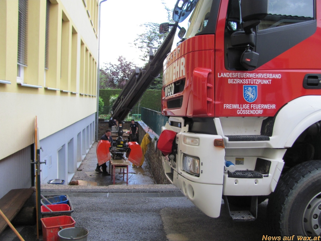 Die FF Gössendorf hat sich wiederum mit Schwergewicht den Schäden in Schule und Gemeindeamt gewidmet. Um die erforderliche Infrastruktur wieder herzustellen, mussten Unmengen an zerstörten Einrichtungsgegenständen abtransportiert, Schlammreste aus den betroffenen Räumen entfernt und die Wände unter Einsatz von Hochdruckrohren gereinigt werden. Für die rund 25 Kräfte der FF Gössendorf gab es jedenfalls den ganzen Tag über mehr als genug zu tun, dabei waren auch drei Fahrzeuge im Einsatz.