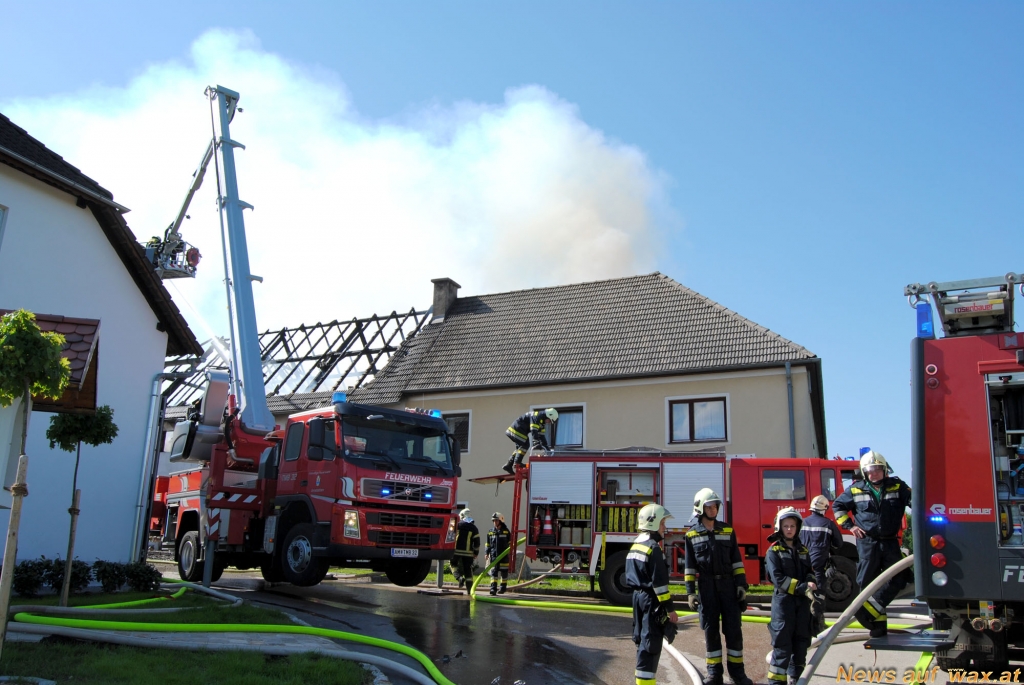 Aus ungeklärter Ursache brach im Dachbereich der Brand aus und breitete sich bis an das angebaute Wohngebäude aus.