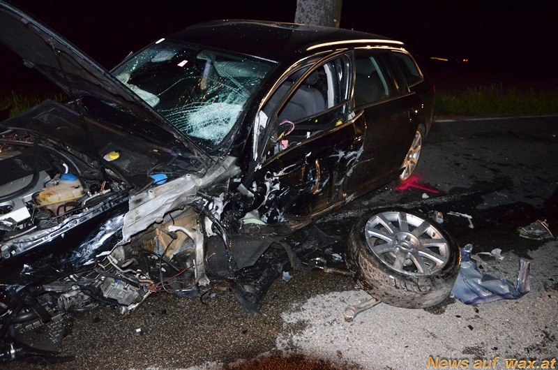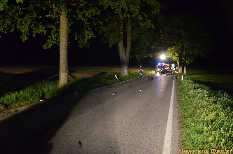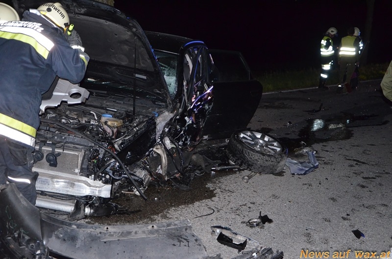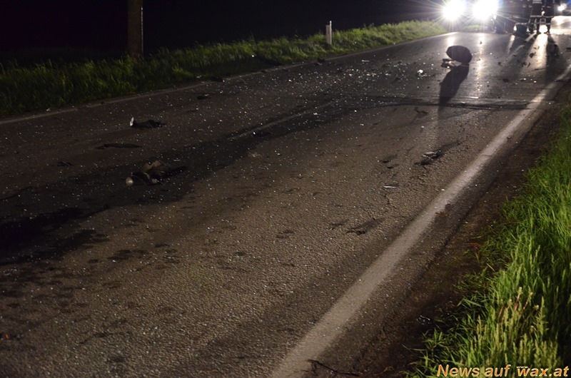 Zu einem schweren Verkehrsunfall kam es am Montagabend auf der B5. Zwei PKW stießen auf dem geraden Straßenstück auf Höhe Großeberharts zusammen. An der Unfallstelle bot sich den Einsatzkräften ein schreckliches Bild. Karosserieteile klebten am Baum, eine Autobatterie, zwei Autoreifen samt Aufhängung und jede Menge Fahrzeugteile lagen auf einer Länge von 100 Metern verstreut.