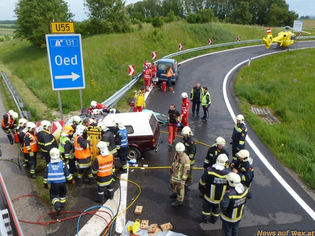 Schwerer Verkehrsunfall auf der A1 Höhe Ausfahrt Oed, Fahrtrichtung Wien. Ein PKW welcher die Autobahn verlassen wollte prallte aus bislang ungeklärter Ursache frontal in die Leitschiene. Dabei wurde der Fahrer im Fahrzeug eingeklemmt und schwer verletzt. Nach der Menschenrettung mit hydraulischem Rettungsgerät wurde der schwerverletzte Fahrer von der Besatzung des Notarzthubschraubers Christophorus 15 versorgt und anschließend ins Unfallkrankenhaus nach Linz geflogen. Seine Beifahrerin konnte das Unfallfahrzeug verlassen, sie wurde vom Notarztwagen Amstetten versorgt und ins Mostviertelklinikum transportiert.