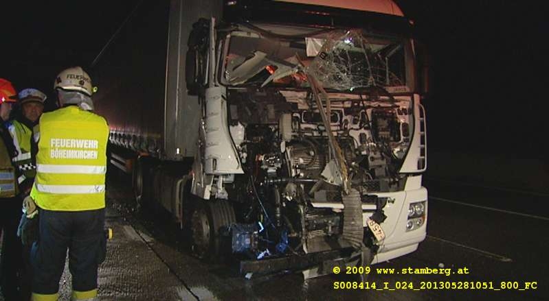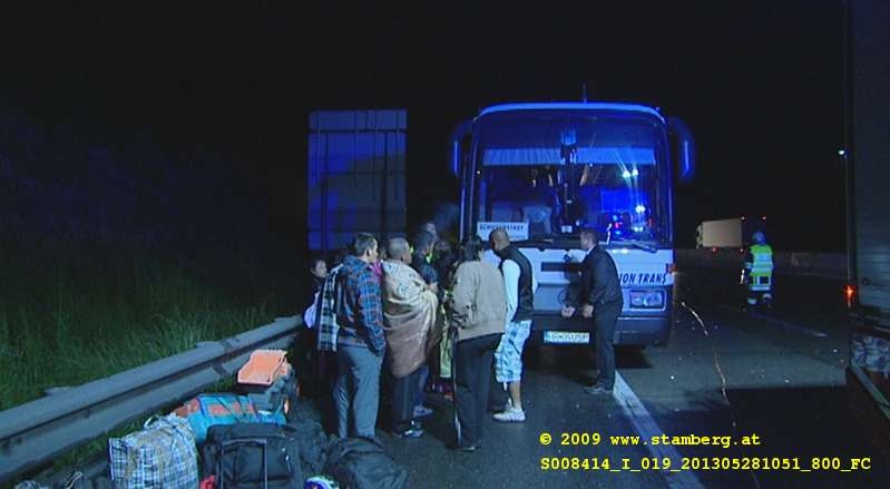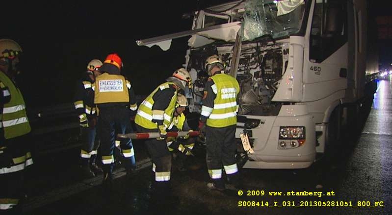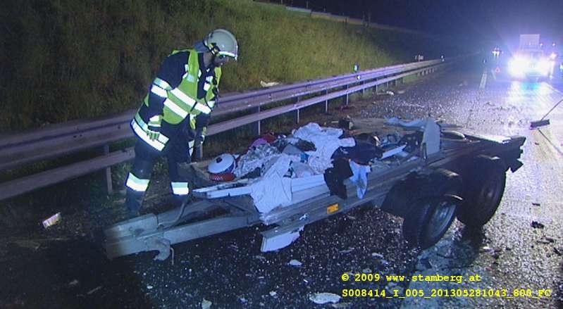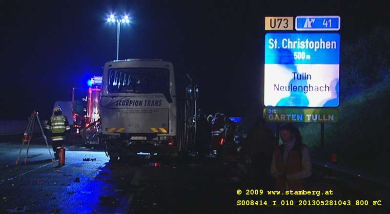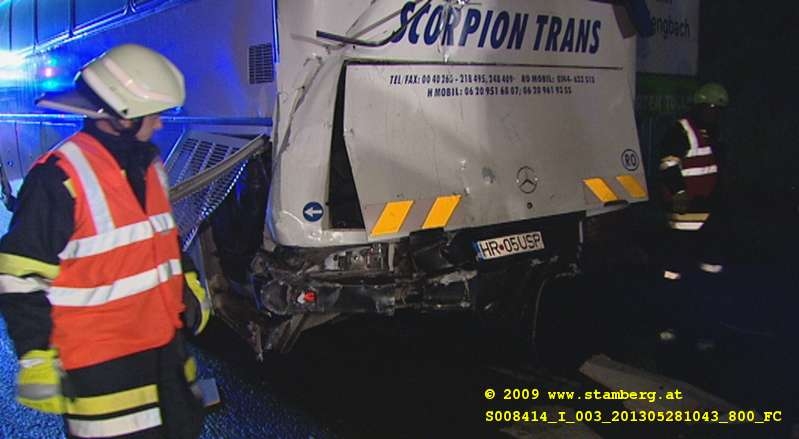 Der Verunfallte LKW, welcher erst ca. 500 Meter nach der eigentlichen Unfallstelle zu stehen kam, wurde von der FF Böheimkirchen angefahren. Aus unbekannter Ursache fuhr ein Sattelschlepper auf einen Reisebus auf. Der Bus besetzt mit 38 Personen zog auch einen Anhänger. In diesem Anhänger waren die Habseligkeiten der Insassen untergebracht, dies erklärte auch das schlachtfeldartige Bild , daß sich den Einsatzkräften bot.
