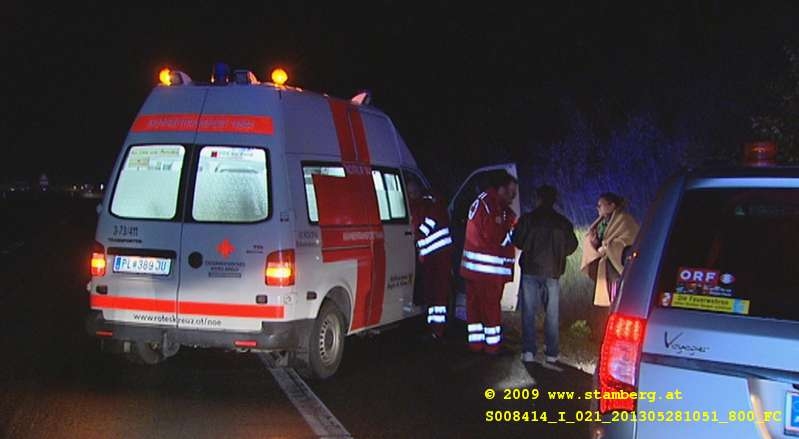 Ein RTW Team des Roten Kreuzes Böheimkirchen versorgt die 3 Verletzten und leistet den die ca. 40 Personen des Reisebusses bis ein Ersatzbus eintrifft Beistand.