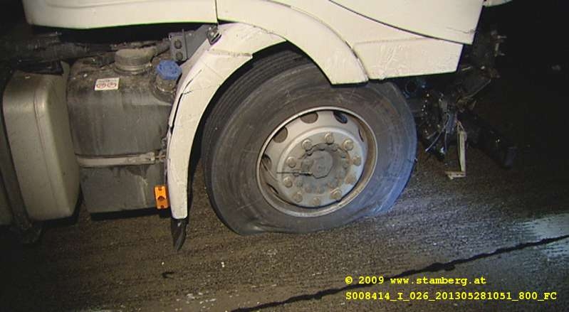 Der Kraftfahrer brauchte ca. einen halben Kilometer bis er sein schwer beschädigtes Sattelzugfahrzeug zum stehen brachte. Teile und der Ladung des Anhängers, verteilten sich ca. 150 Meter weit über die Fahrbahn.