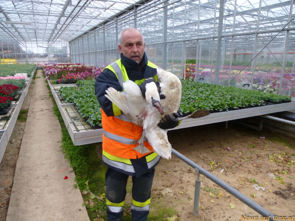 Vermutlich aufgrund der schlechten Witterungsverhältnisse stürzte ein Schwan durch eine Glasscheibe eines Gewächshauses der ortsangehörigen Gärtnerei. Durch die Wucht des Aufpralls zerbrach die Scheibe, sodass der schwerverletzte Schwan am Boden des Gewächshauses zu liegen kam. Die Feuerwehrkameraden bargen das Tier äußerst behutsam, um weitere Verletzungen zu vermeiden und den aufgewühlten Schwan zu beruhigen.