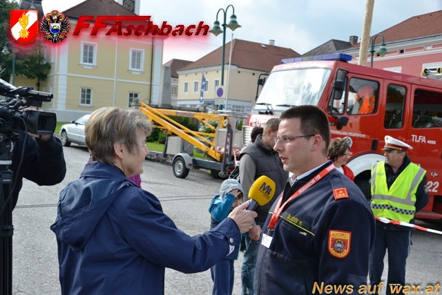 Die Feuerwehr Aschbach veranstaltete am 25.05.2013 am Rathausplatz eine Leistungsschau mit dem Roten Kreuz und der Polizei. Im Vorfeld zu dieser Einsatzübung überreichte Kommandant HBI Mario Üblacker eine Urkunde an Dir. Cornelia Wagner Sturm für die gute Zusammenarbeit zwischen Feuerwehr und der neuen Mittelschule. Anschließend konnten die Einsatzkräfte ihr Können unter Beweis stellen.