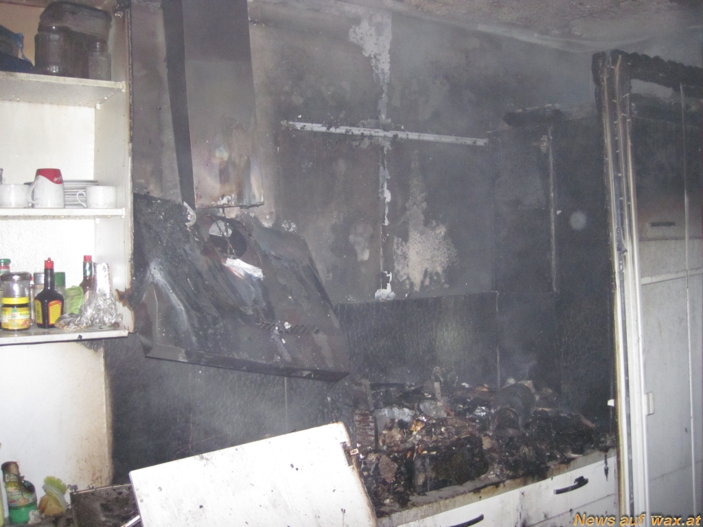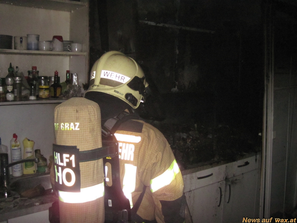 Für die mit einer Löschbereitschaft bestehend aus fünf Fahrzeugen und 21 Mann angerückte Berufsfeuerwehr war der Küchenbrand heute Nacht in der Grazer Göthestraße ein Standardfall. Mittels Hochdruckrohr wurde unter schwerem Atemschutz im Innenangriff in den zweiten Stock vorgegangen und der bereits auf den halben Küchenblock und angrenze nde Möbel ausgebreitete Brand rasch bekämpft. Die Abplatzungen an der Decke wiesen auf Temperaturen von mehreren hundert Grad im Brandraum hin. Parallel dazu wurde das Stiegenhaus und in weiterer Folge die Brandwohnung mittels Hochleistungslüfter entraucht und die über dem Brandgeschoß gelegenen Wohnungen kontrolliert. Als Brandursache wird ein Elektrogerät vermutet, das sich auf der Arbeitsplatte der Küche befunden hat.