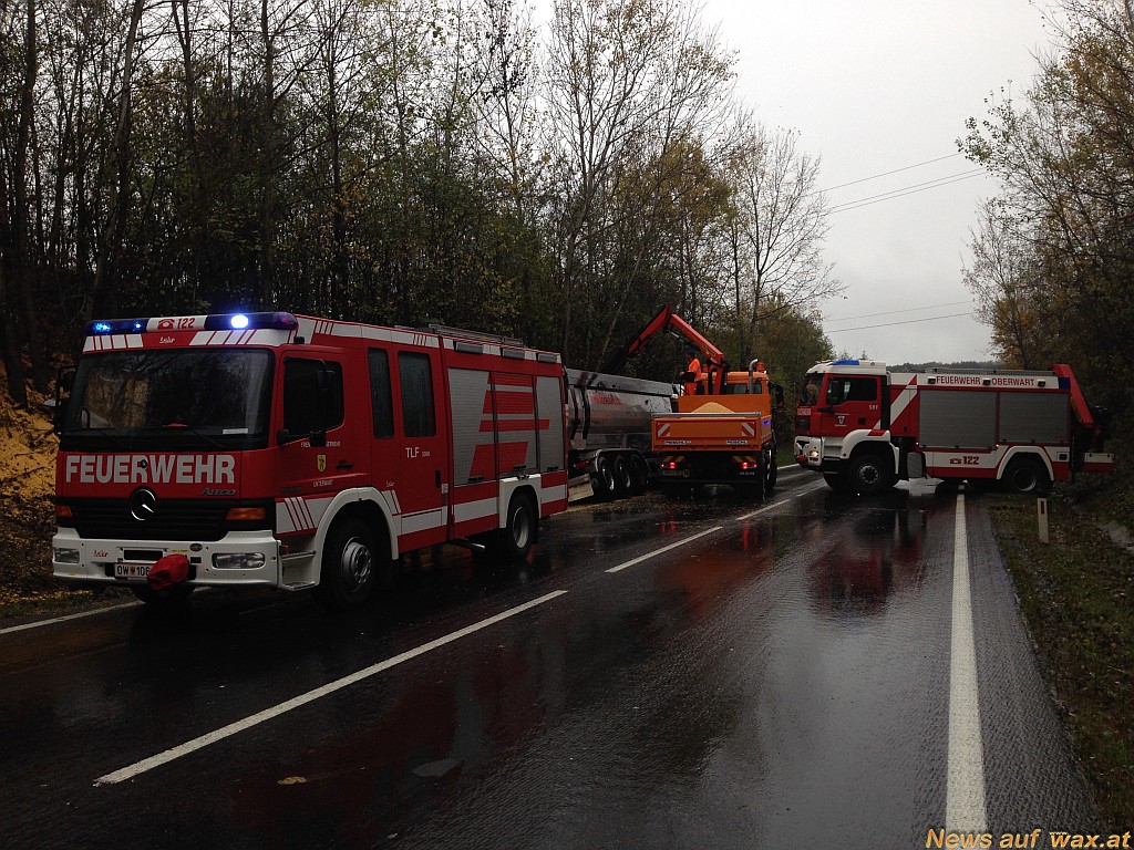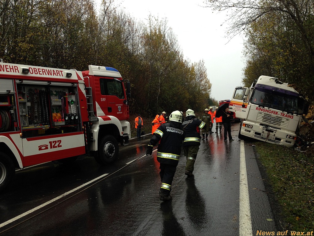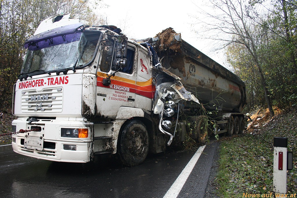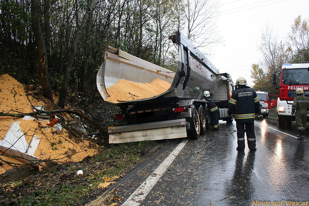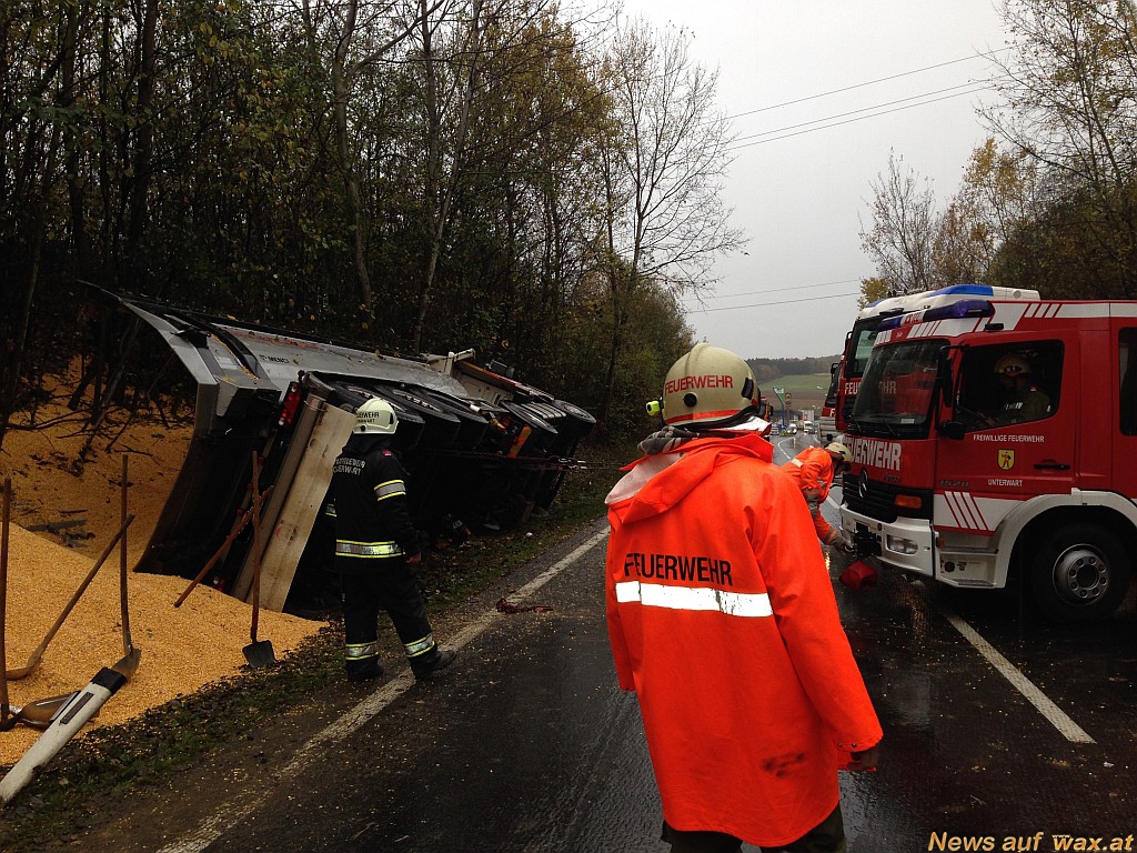 Wie durch ein Wunder blieb der Lenker der Zugmaschine bei diesem Unfall unverletzt. Die Entladung gestaltete sich äußerst schwierig, da der Anhänger mit der offenen Seite zu einer hohen Böschung mit Bäumen ragte. Da sich die Ladung Mais auf der Straße beziehungsweise im Anhänger befand, wurde für die Bergung die Feuerwehr Unterwart mit einer 5to Seilwinde sowie für die Reinigung das Straßenbauamt hinzugezogen.