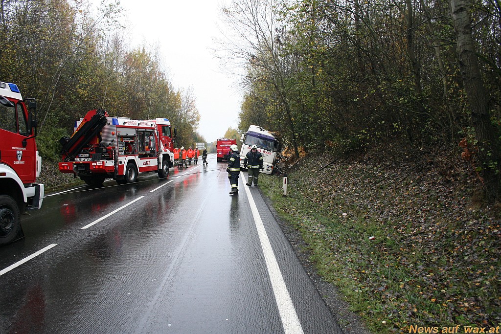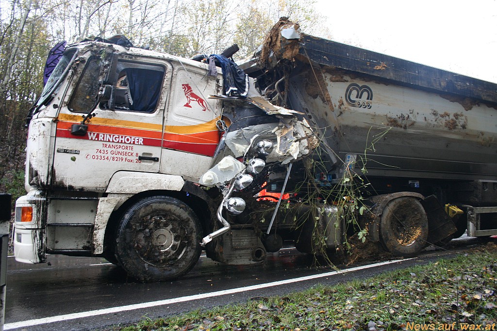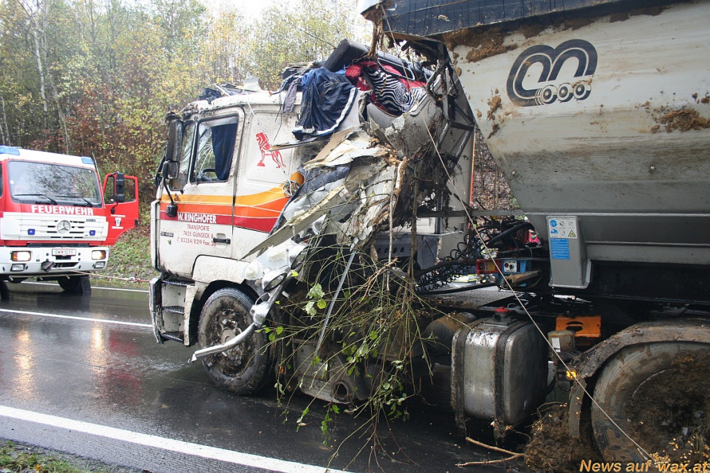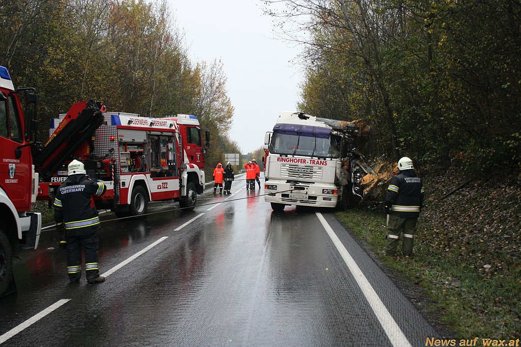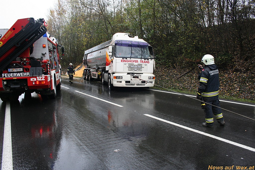 Wie durch ein Wunder blieb der Lenker der Zugmaschine bei diesem Unfall unverletzt. Die Entladung gestaltete sich äußerst schwierig, da der Anhänger mit der offenen Seite zu einer hohen Böschung mit Bäumen ragte. Da sich die Ladung Mais auf der Straße beziehungsweise im Anhänger befand, wurde für die Bergung die Feuerwehr Unterwart mit einer 5to Seilwinde sowie für die Reinigung das Straßenbauamt hinzugezogen.