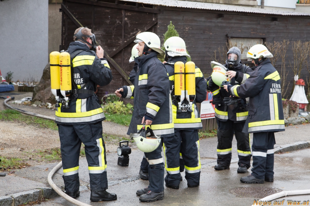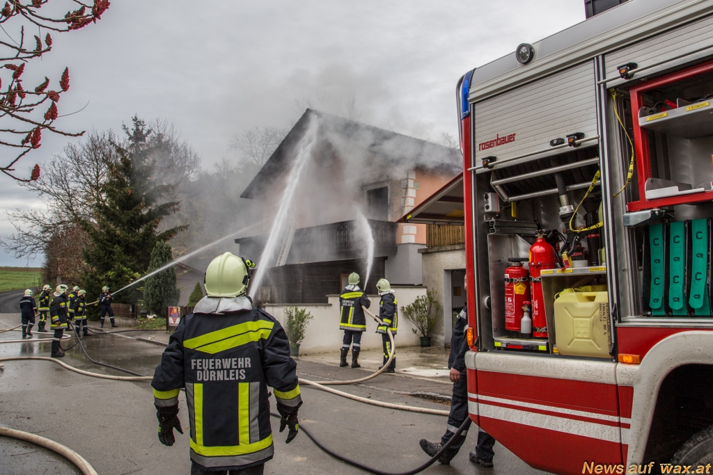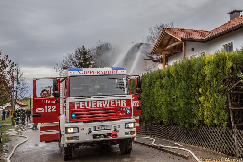 Einsatzleiter Karl Grüner löste deshalb Alarmstufe 3 aus und somit begaben sich noch 3 weitere Fahrzeuge aus Dürnleis und Wullersdorf zum Einsatzort. Die ersten Feuerwehrmitglieder aus Haslach starteten sofort einen Löschangriff von außen um das Übergreifen in den Dachbereich zu unterbinden. Die Feuerwehrmitglieder aus Nappersdorf begaben sich unter schwerem Atemschutz in das Brandobjekt um dort die betroffenen Räumen gezielt abzulöschen. Die Maßnahmen zeigten rasch Wirkung und der Brand war nach einigen Minuten unter Kontrolle.
