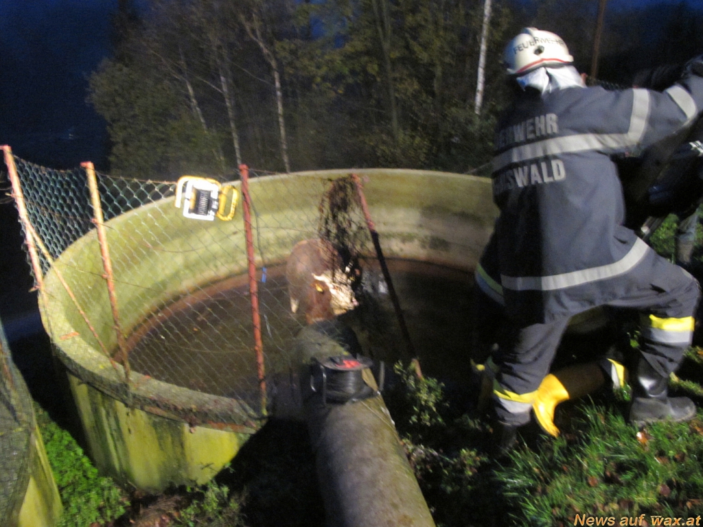 Kurz vor sechs Uhr morgens wurden die Eibiswalder Kameraden nach Rothwein gerufen. Eine trächtige Kuh war in eine Güllegrube gefallen und konnte sich nicht mehr befreien. Als die Feuerwehrkameraden am Einsatzort eintrafen wurde die Kuh zunächst von einem Tierarzt mit einem Beruhigungsmittel ruhig gestellt. In weiterer Folge konnte die Kuh mit dem Ladekran des Schweren Rüstfahrzeuges aus der Grube gehoben werden. Kurz nach der Rettung brachte die Kuh das Kalb auf die Welt, beide sind wohlauf.