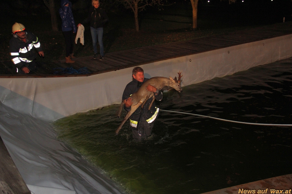 Kurz nach 17.00 Uhr erfolgte wieder die Alarmierung zu einer Tierrettung. Diesmal galt es ein Reh, das in Stammeregg in einen Pool gefallen war zu retten. Ein Kamerad, selbst Jäger und im Umgang mit Wildtieren versiert stieg durch eine Leine gesichert in das Becken und konnte es aus diesem Befreien. Sekunden nach der Rettung suchte das glücklicherweise unverletzte Tier das Weite.