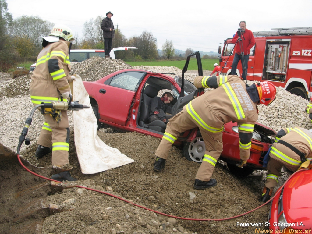 Am 16.11.2013 beteiligte sich die FF St. Georgen im Attergau an der alljährlich bezirksweit stattfindenden Rettungsübung. Übungsannahme war ein Verkehrsunfall mit drei PKW´s, einem LKW, einem Radlader und rund 13 Verletzten in der Schottergrube. Aufgrund der intensiven Zusammenarbeit mit dem Roten Kreuz und dem dauernden Training der Technical Rescue Teams, konnten von der Feuerwehr die Verletzen innerhalb kürzester Zeit aus den deformierten Fahrzeugen befreit und den Sanitätern zur weiteren Behandlung übergeben werden.