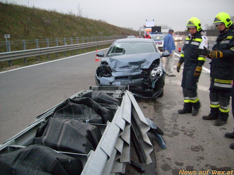 Bei der Erkundung stelle der Einsatzleiter fest, dass ein Fahrzeug frontal gegen den Fahrbahnteiler der Abfahrt Baden geprallt ist. Dabei wurden die Dämpfungselemente vollständig zusammengepresst. Aufgrund dieser Elemente konnte der Aufprall so stark vermindert werden, dass sich der Lenker glücklicherweise keine Verletzungen zuzog. Das Fahrzeug wurde auf die Hubbrille des LAST – Fahrzeuges verladen und gesichert abgestellt.