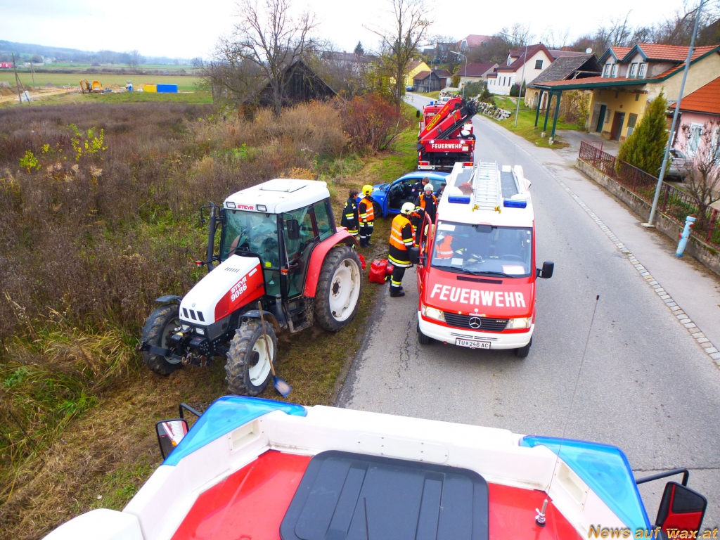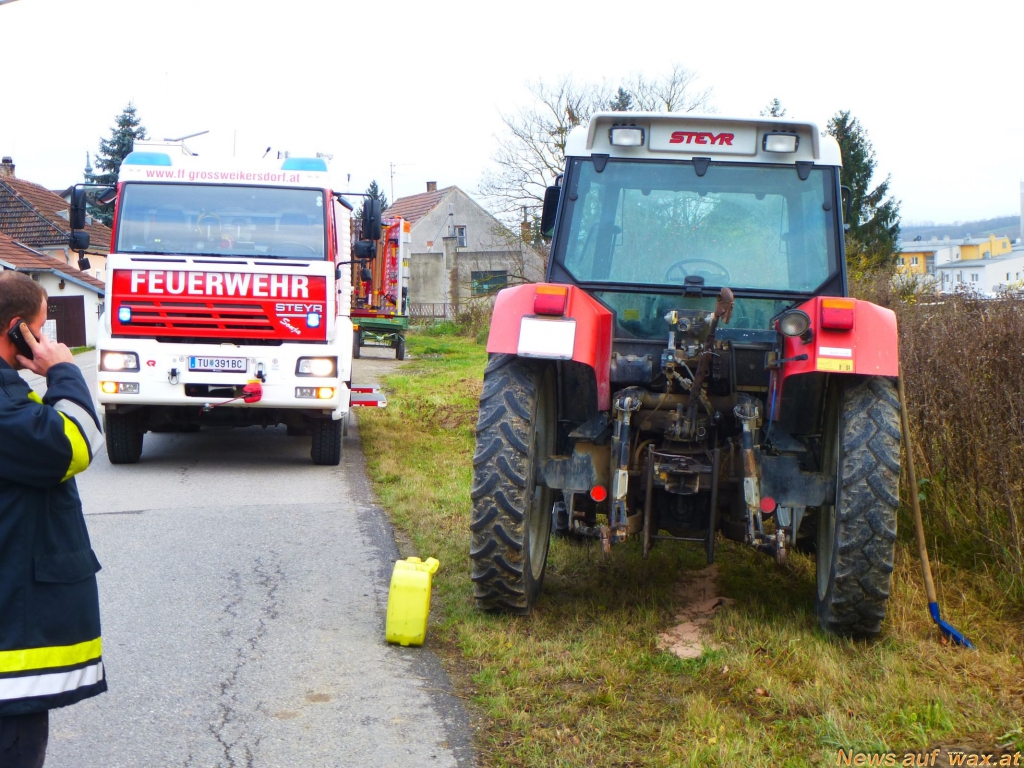 Eine Einsatzmannschaft befand sich kurz vor 14 Uhr mit dem Rüstlöschfahrzeug auf dem Weg zu einem Einsatz, als diese auf eine Ölspur in der Hollabrunner Straße aufmerksam gemacht wurde. Umgehend wurde umgekehrt, um die Lage zu begutachten. Bei einem Traktor trat aufgrund eines Defekts Hydrauliköl aus und floss in das Erdreich. Vor Ort eingetroffen, wurde die Einsatzstelle abgesichert und eine Nachalarmierung weiterer Einsatzkräfte über Florian Niederösterreich veranlasst.