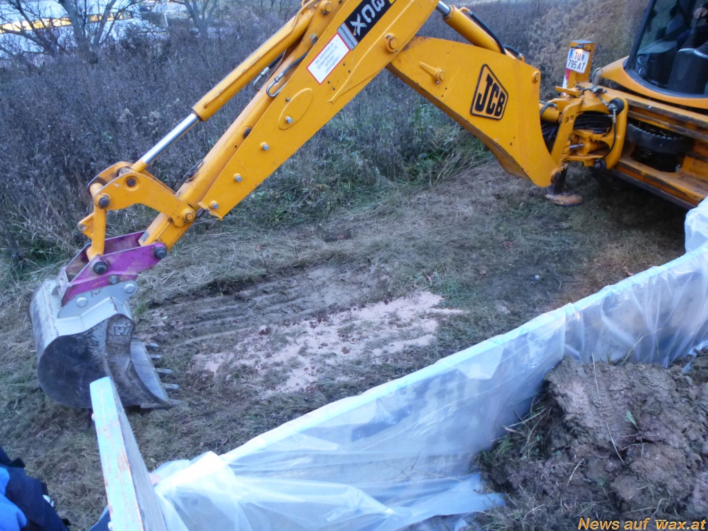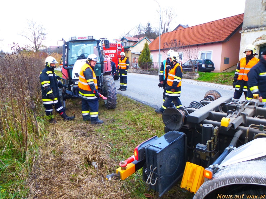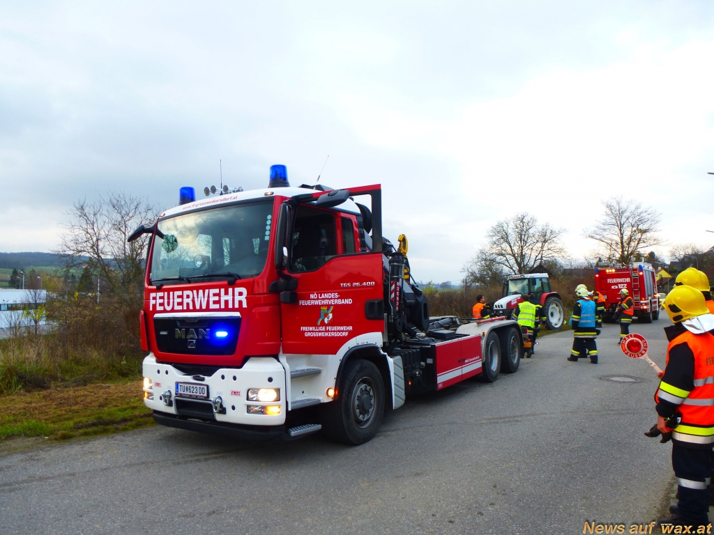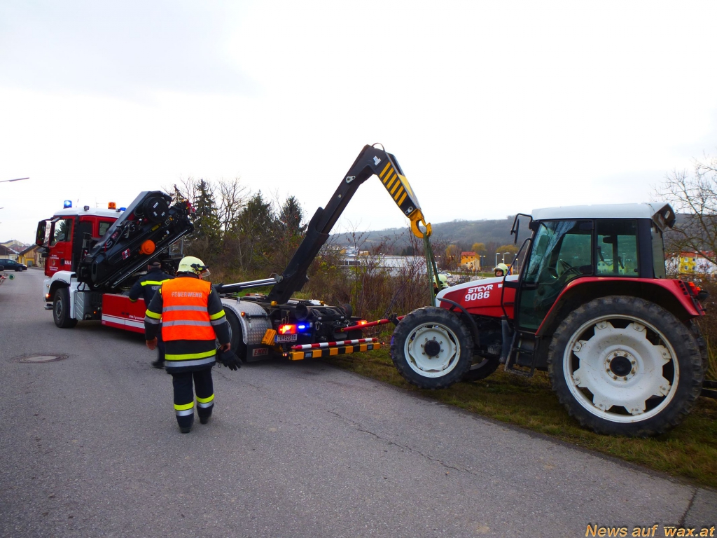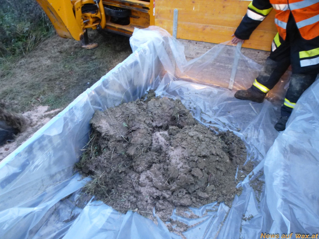 Mit Hilfe einer Abschleppstange und dem Multilift-Hakengerät wurde der Traktor durch das Wechselladefahrzeug entfernt und gesichert abgestellt. Das ausgeflossene Hydrauliköl wurde mittels Ölbindemittel gebunden und aufgesammelt. Nach Rücksprache mit der Bezirkshauptmannschaft Tulln wurde entschieden, dass auch das verseuchte Erdreich fachgerecht entsorgt werden muss. Mit einem Schaufelbagger, den die Gemeinde Großweikersdorf zur Verfügung stellte, wurde die Erdoberfläche ca. 10 cm tief abgegraben und auf einen Anhänger verladen.
