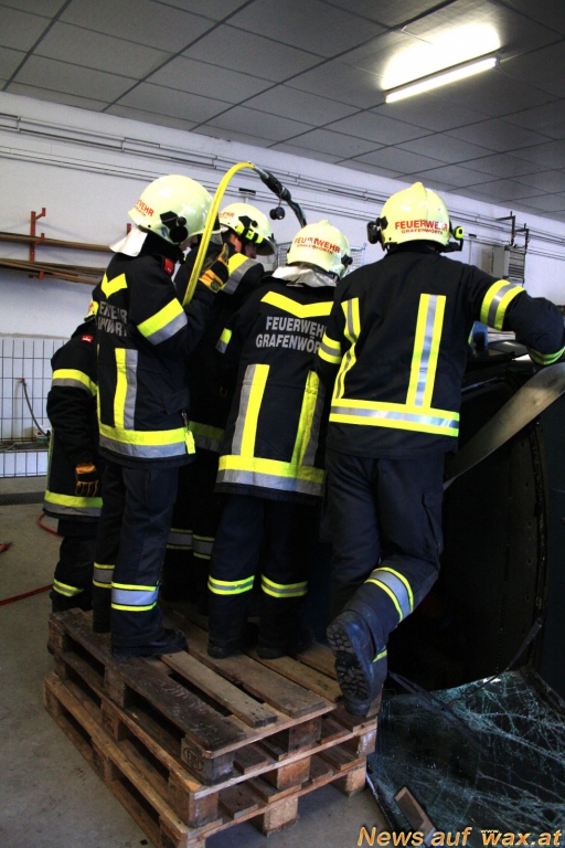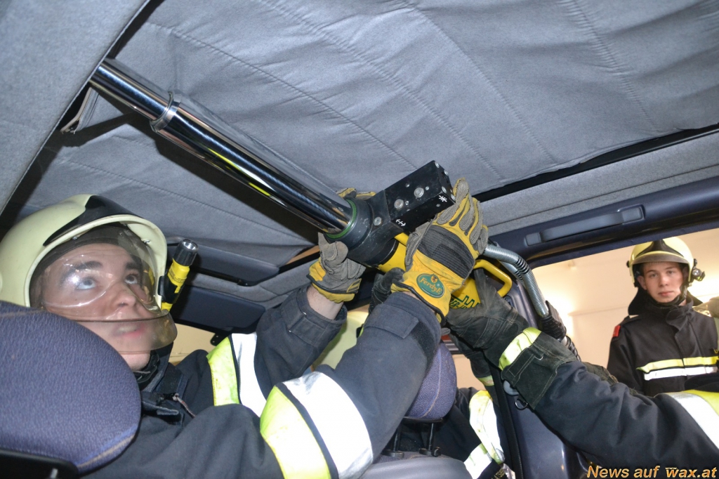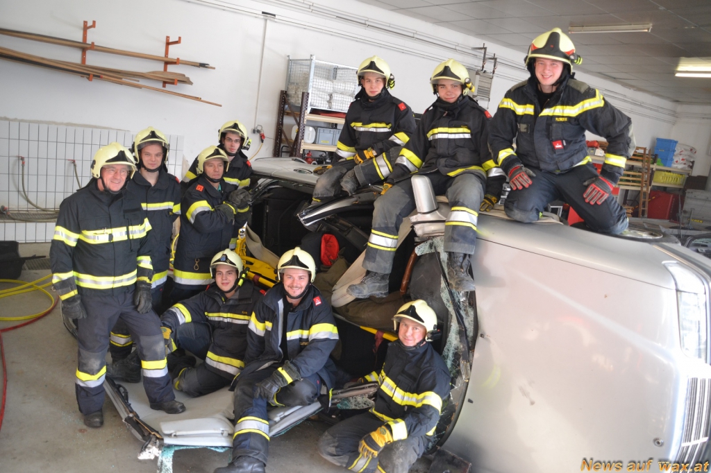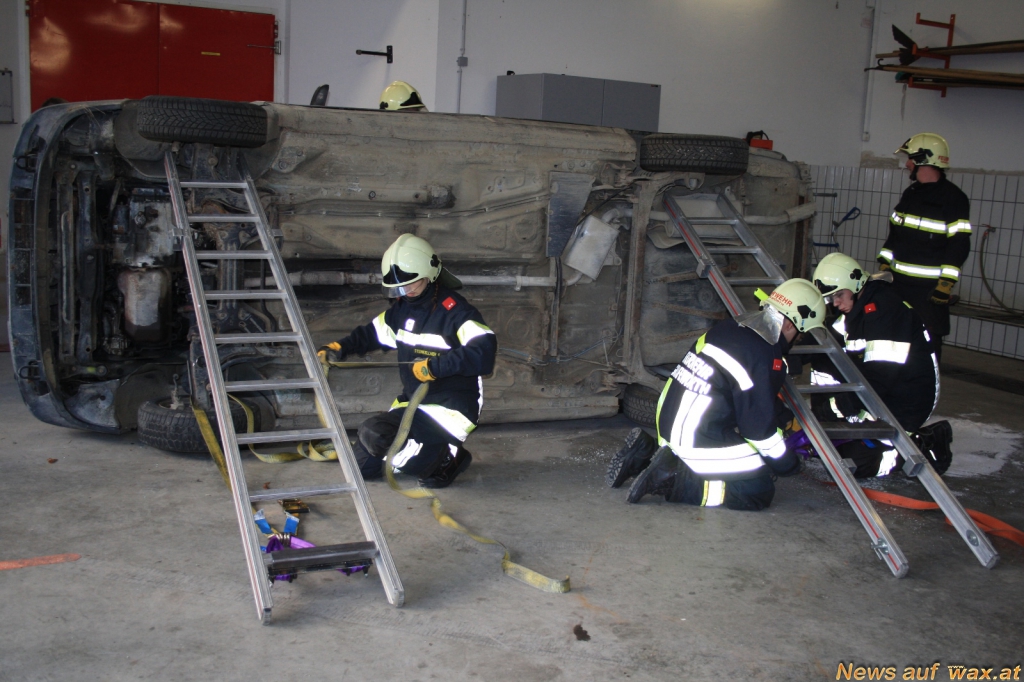 Mit den Grundlagen hielt man sich jedoch nicht lange auf, sondern kam gleich zum praktischen Teil. Je drei PKW in verschiedenen Deformationsgraden und Unfalllagen standen den Übungsteilnehmern in der Halle des Feuerwehrhauses zur Verfügung. Ein PKW, der "ganz normal" auf der Straße steht, ein PKW, der seitlich an ein Objekt geprallt war und ein PKW in Seitenlage.