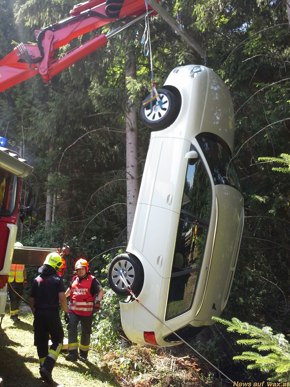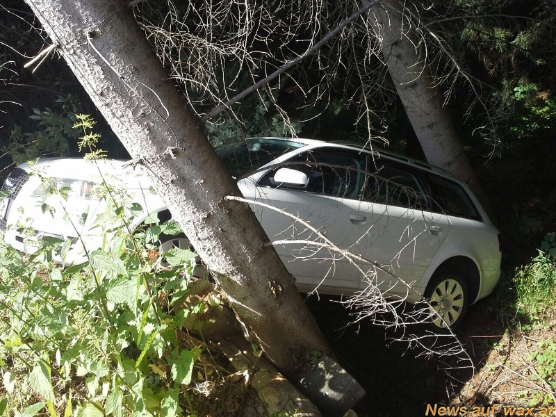 us unbekannter Ursache fing dieser zu rollen an und stürzte über eine Böschungssicherung ca. 3 Meter in die Tiefe. Ein starker Baum verhinderte ein weiteres abrutschen des Fahrzeuges und lies danach den PKW mit dem Heck am Boden und der Front Richtung Himmel zeigend stehen. Nachdem wir ein paar Äste mit der Säge entfernten, wurde der PKW mit dem Kran des Lastfahrzeuges behutsam aus seiner misslichen Lage geborgen und wieder auf die Räder gestellt.