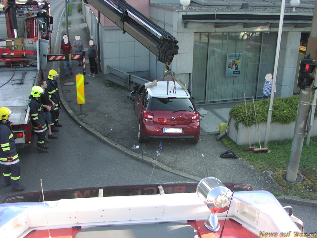 Fahrzeuges von der Straße ab und fuhr in die Fassade des Bankgebäudes. Der