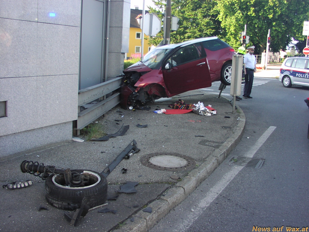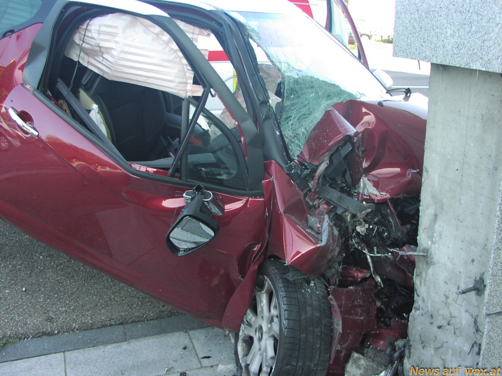 OÖ: Verkehrsunfall - Auto kam an Fassade eines Bankgebäudes schwer beschädigt zum Stillstand