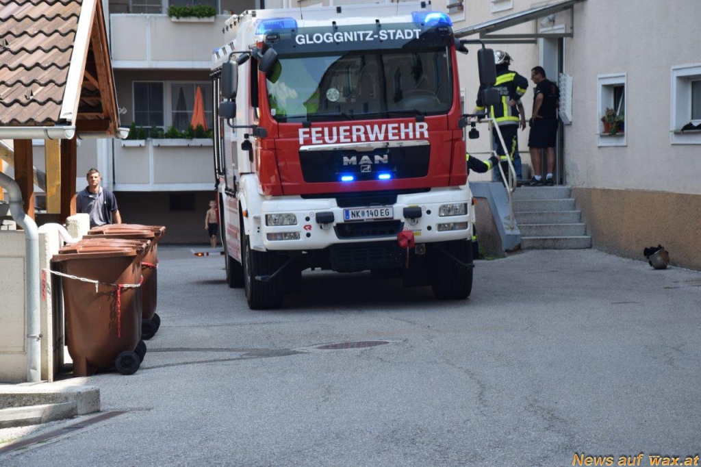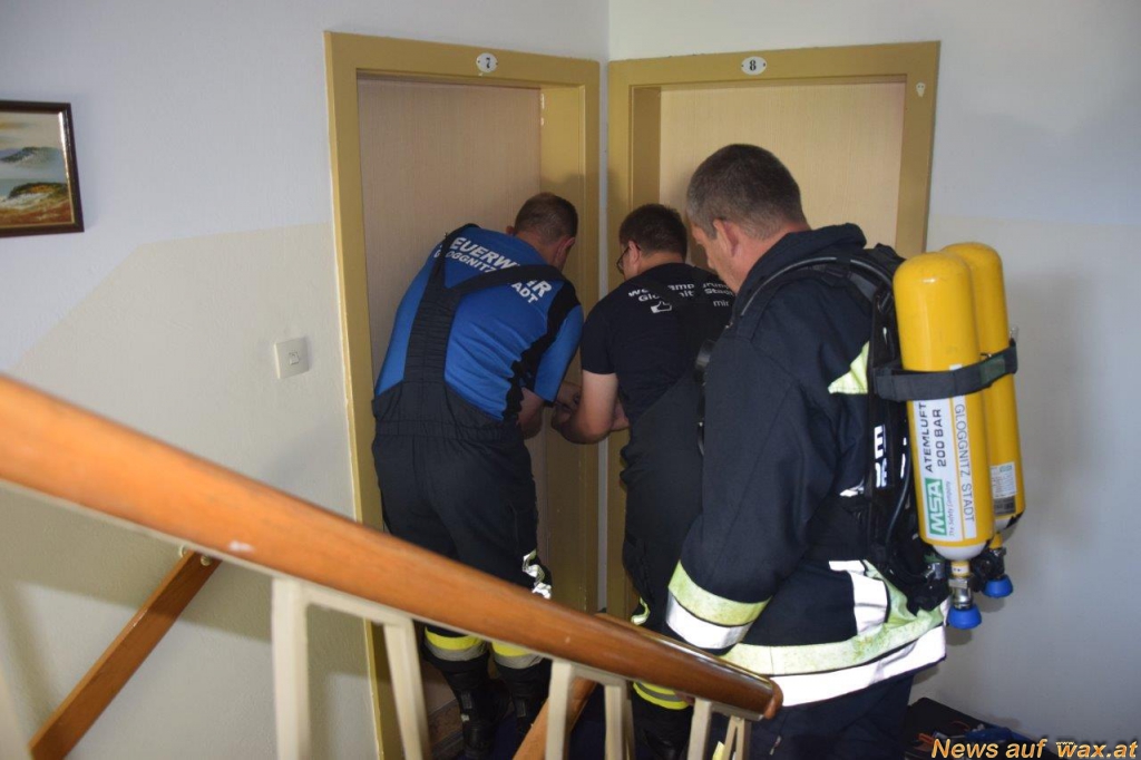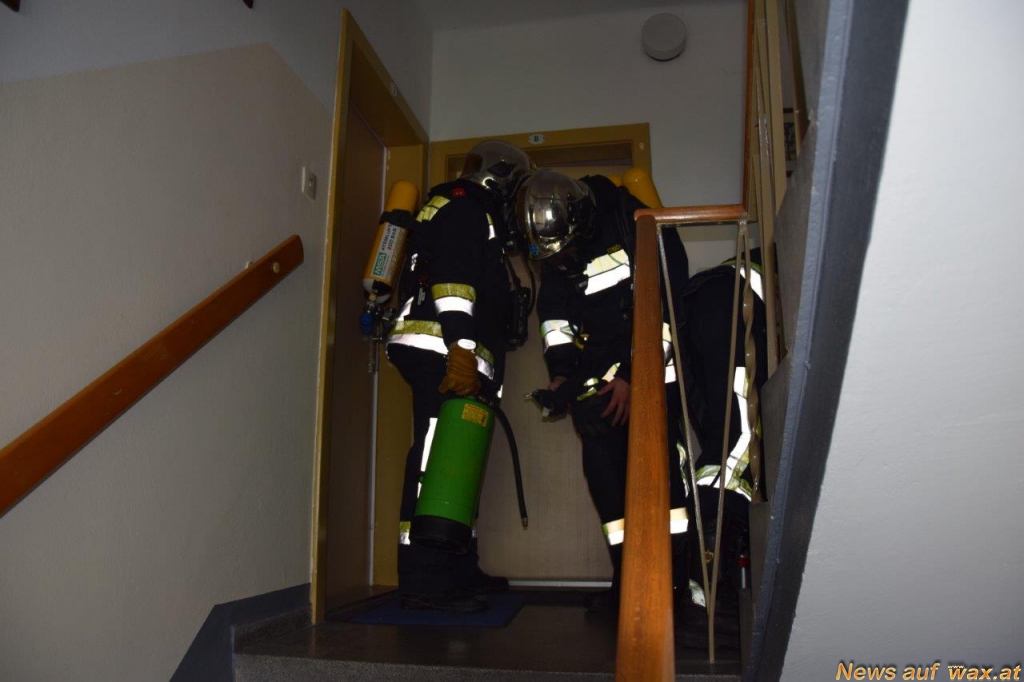 Das Stiegenhaus eines 3-stöckigen war komplett verraucht. Trotz brennender Hitze (über 30°C) begab sich ein Trupp mit schwerem Atemschutz auf Suche der Brandursache. Nach einiger Zeit konnte Rauch in einer Wohnung im obersten Stockwerk wahrgenommen werden. Nach dem Aufbrechen einer Tür und weiteren Sicherungsmaßnahmen konnte der Schwelbrand mittels eines Bioversal-Löschers ohne weitere Schäden abgelöscht werden.