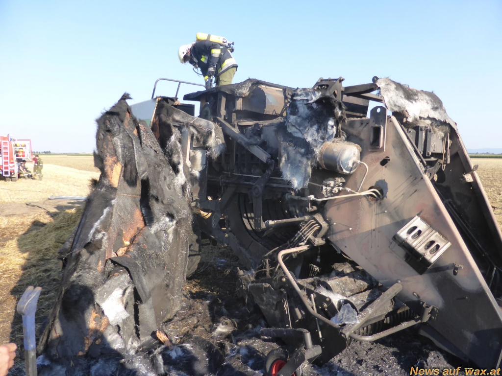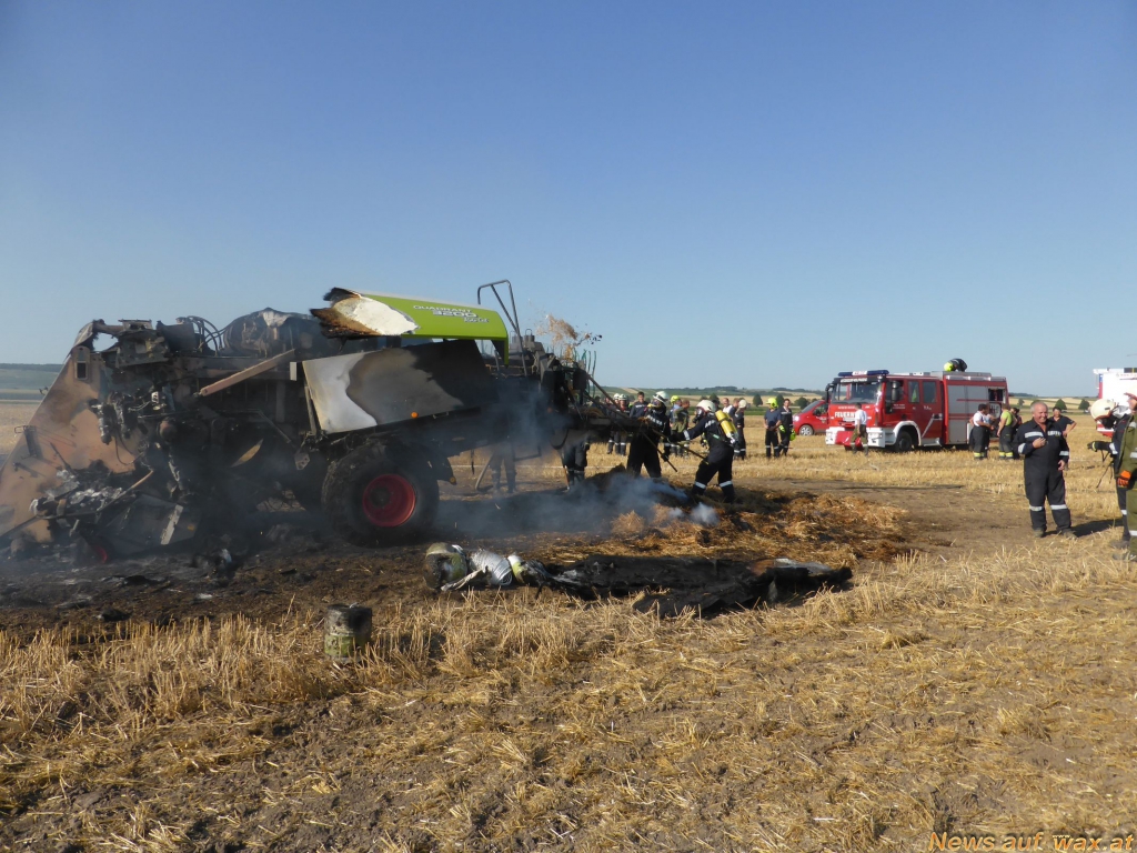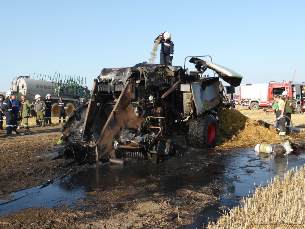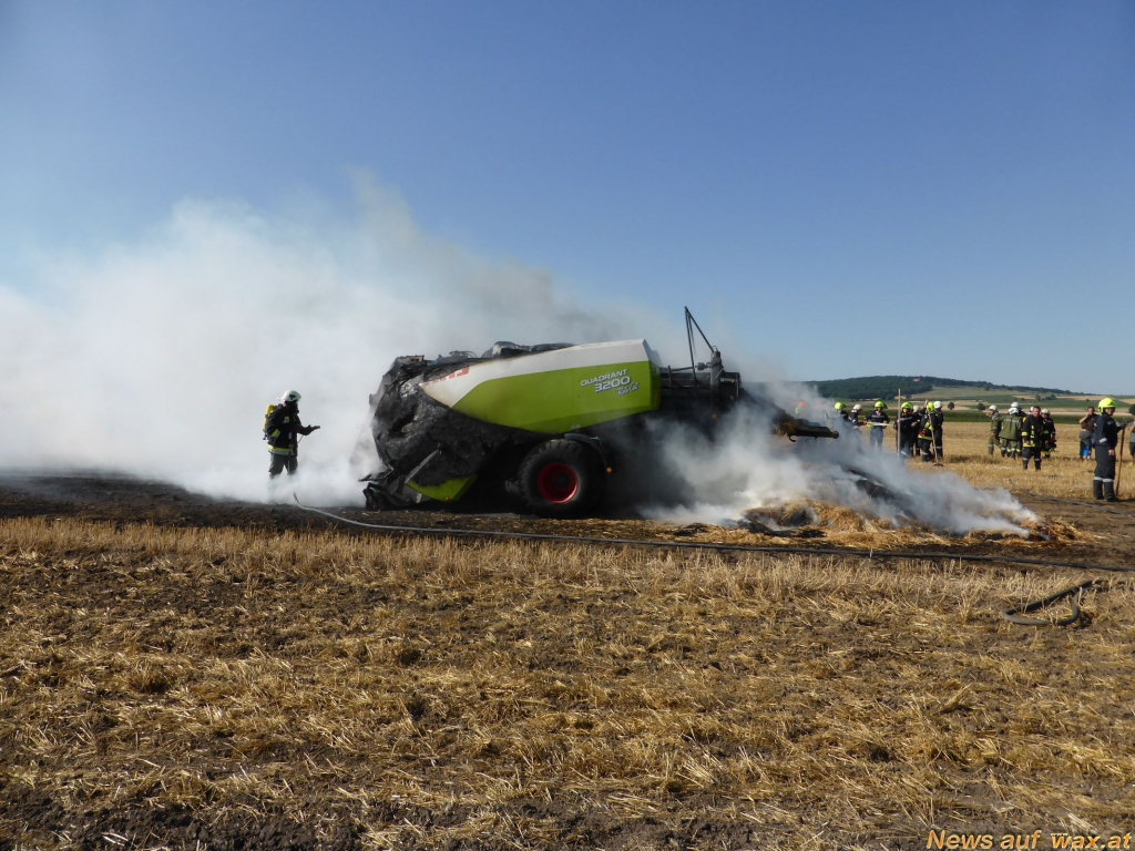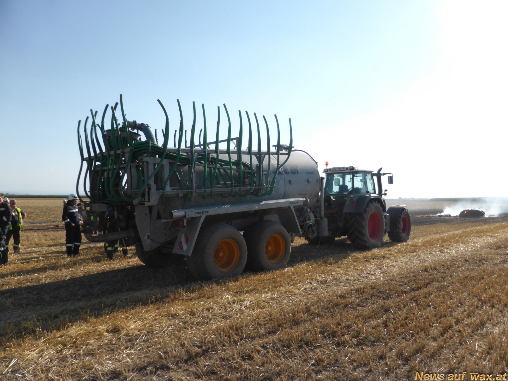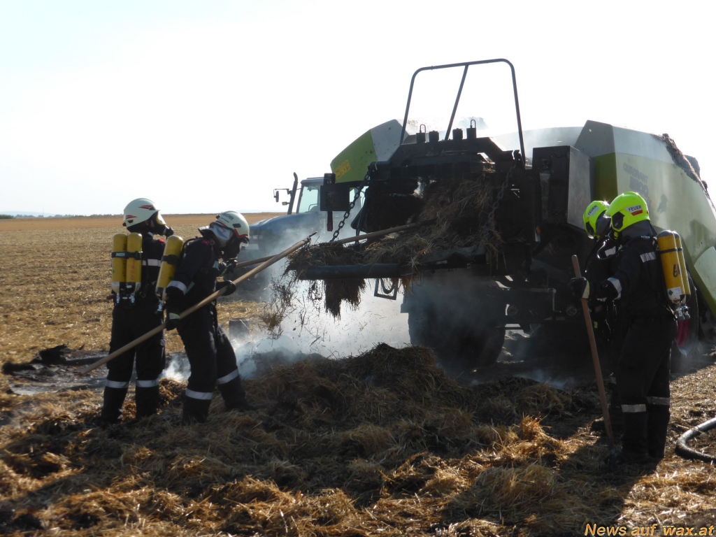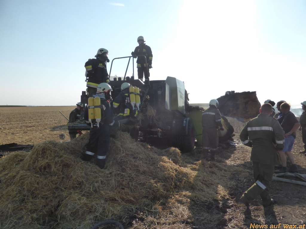 Auf einem Feld in der Nähe der Stranzendorfer Brücke der B4 war eine Strohpresse in Brand geraten. Darauf wurde ein Brandalarm der Stufe 2 für die Feuerwehren Großweikersdorf, Niederrußbach, Pettendorf, Seitzersdorf-Wolfpassing und Stranzendorf ausgelöst. Beim Eintreffen der FF Großweikersdorf an der Einsatzstelle hatte die FF Niederrußbach schon mit der Brandbekämpfung bei der Strohpresse begonnen. Der Brand hatte aber auch auf das abgemähte Feld übergegriffen und schon einen großen Teil des Feldes abgebrannt. Nun drohte der Brand auf ein weiteres Feld überzugreifen. Mittels Hochdruck-Schnellangriffseinrichtung bekämpften die Feuerwehren Großweikersdorf und Stranzendorf den Brand und konnten ein Übergreifen verhindern. Das Ablöschen der Strohpresse gestaltete sich schwierig, da diese mit Stroh gefüllt war und nur unter Atemschutz gelöscht werden konnte. Erschwerend waren wieder die sommerlichen Temperaturen um die 36°C, die den Einsatzkräften in ihrer Einsatzbekleidung, vor allem den Atemschutztrupps zu schaffen machten, weshalb vom Einsatzleiter vorsorglich auch das Rote Kreuz alarmiert wurde. Auf Grund der großen Entfernung zur nächsten Wasserentnahmestelle, wurden zwei Vakuumfässer mit je 14.000 Liter Wasser bereitgestellt, welche die Wasserversorgung sicherstellten. Erst unter Einsatz von mehreren Atemschutztrupps konnte die Strohpresse komplett entladen und der Brand gelöscht werden. Die letzten Einsatzkräfte konnten nach ca. 3 Stunden wieder einrücken. Im Einsatz standen für ca. 3 Stunden die FF Großweikersdorf mit 20 Mitgliedern und 3 Fahrzeugen (Rüstlösch-, Lösch-, und Mannschaftstransportfahrzeug) die FF Pettendorf die FF Seitzersdorf-Wolfpassing die FF Niederrußbach die FF Stranzendorf das Rote Kreuz Großweikersdorf die Polizei