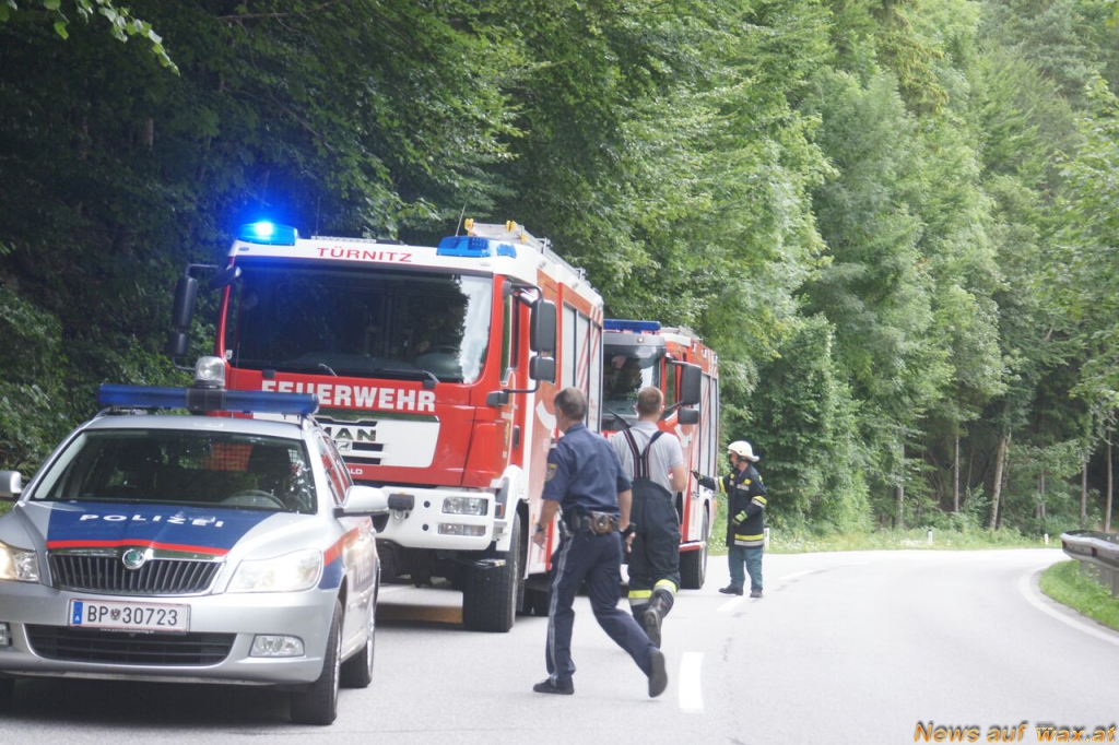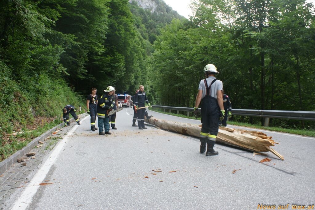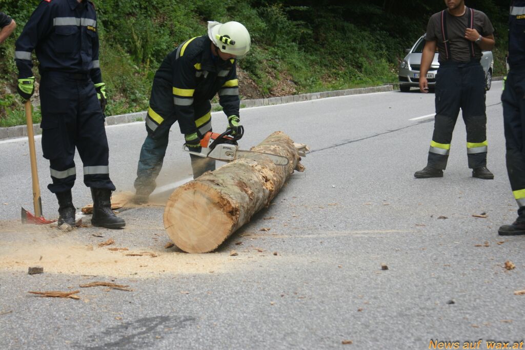 Wehrend im Scharbachtal am Festgelände die letzten Vorbereitungen für das Heutige Feuerwehrfest stattfanden wurde die FF Türnitz von Florian St.Pölten mit Stillen Alarm zu einer Technischen Hilfeleistung Siebenbrunn Baum über Straße B20 alarmiert.Beim eintreffen wurde die Gefahrenstelle bereits von einem Rettungswagen der zufällig vorbeikam mit Blaulicht Abgesichert. Die mitalarmierte Polizei Türnitz Sperrte kurzfristig die b 20 wehrend der Bergungsarbeiten der Baum wurde in drei Teile zerschnitten und konnte gesicherten am Straßenrand Abgelegt werden .Glücklicherweise fuhren zum Zeitpunkt wo der Baum auf die Straße donnerte keine Fahrzeuge auf der Straße und somit gab es weder Blech noch Personenschaden