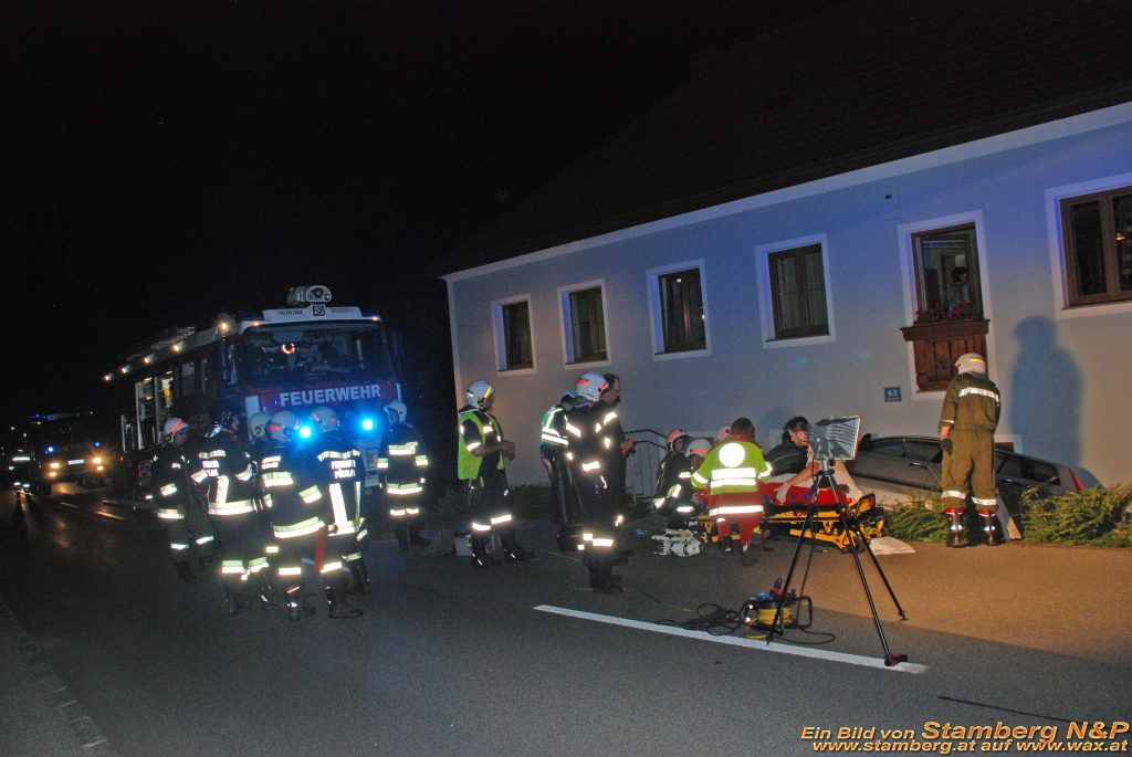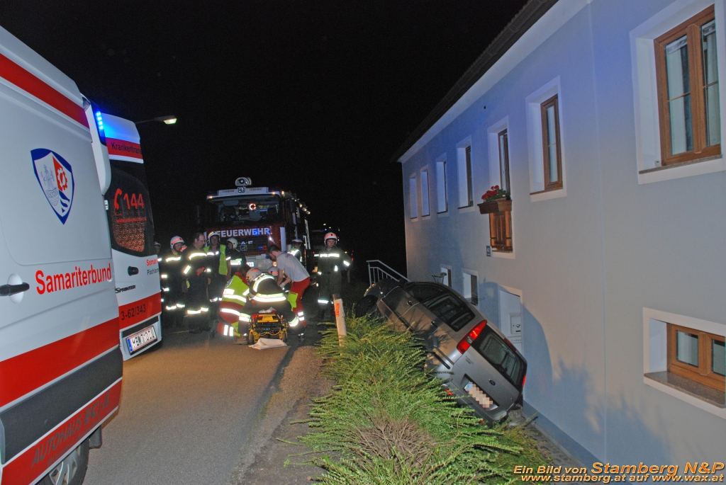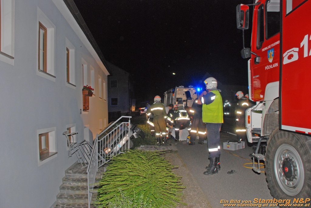 Um 00:36 den 29.07.2015 wurden wir mittels Pager und Sirene zu einen Verkehrsunfall mit Menschenrettung alarmiert worden. Im Ortsteil Kellerhäuser in Pöchlarn kam eine junge Lenkerin aus derzeit ungeklärten Gründen von der Fahrbahn ab und fuhr gegen ein Stiegengeländer und touchierte eine Hausmauer.