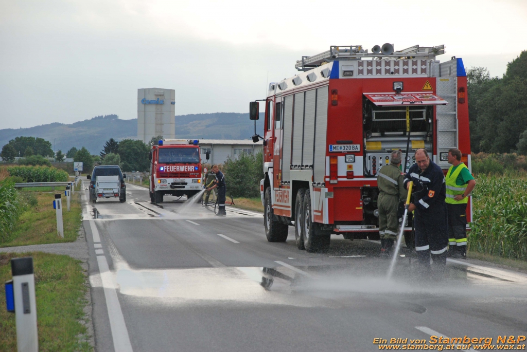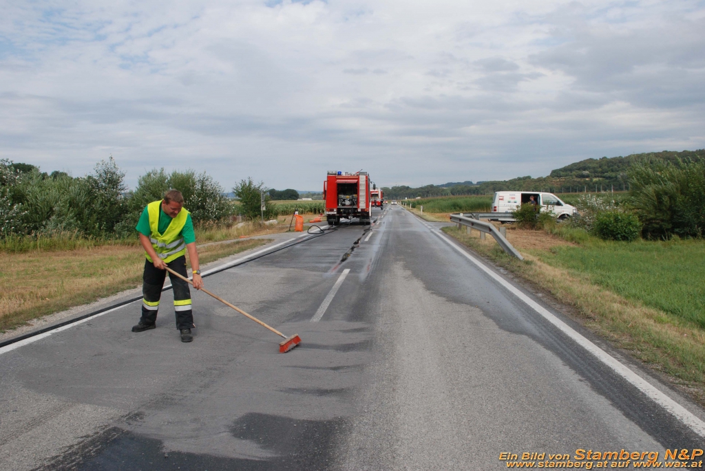 Heute den 28.07.2015 wurden wir mittels Pager am Nachmittag um 15:48 zur Beseitigung einer Ölspur alarmiert. Zwischen Pöchlarn und Wörth auf der Anton Lasselsberger Strasse hatte ein Landwirt bei seinen Traktor Öl verloren und hatte eine Ölspur von knappe 300m hinter hergezogen bevor er es bemerkte. Mit Ölbindemittel wurde das ausgeronnene Öl gebunden und anschließend mit einer Kehrmaschine der Stadtgemeinde Pöchlarn zusammen gekehrt.