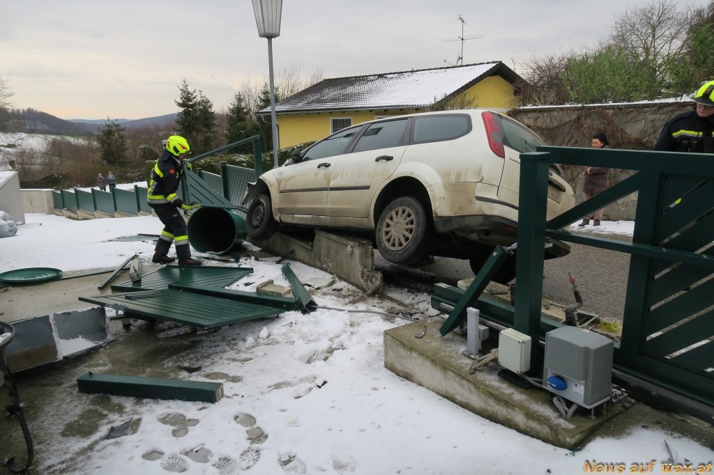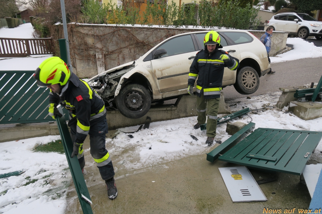 Nach einer Stunde konnte die Feuerwehr Ollern wieder einrücken. Beim Unfallhergang wurde auch der Zaun, die Mauer und das Fahrzeug selbst erheblich beschädigt. Personen wurden keine Verletzt.