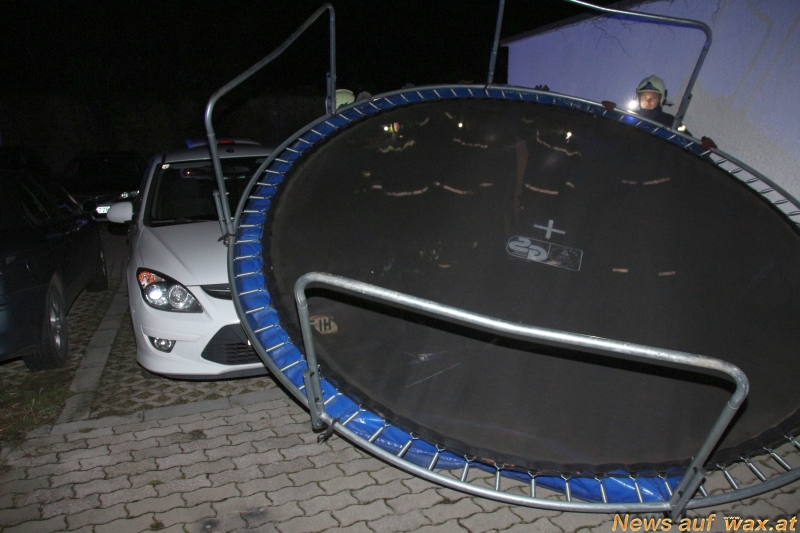Nach einer kurzen Verschnaufpause wurden die Maria Enzersdorfer Feuerwehrmitglieder um 3:42 Uhr neuerlich zu einem Sturmschadeneinsatz alarmiert. Abermals handelte es sich um ein Trampolin, das diesmal auf einem Parkplatz in der Hauptstraße auf ein geparktes Auto stürzte. Händisch wurde das Turngerät entfernt und gesichert abgelegt.
