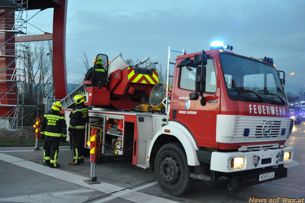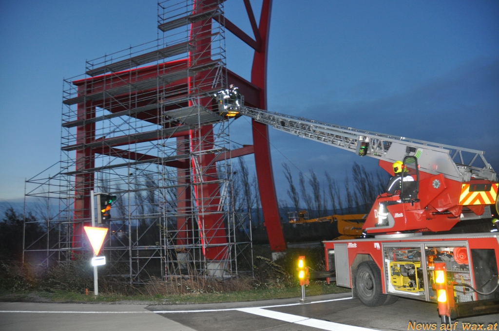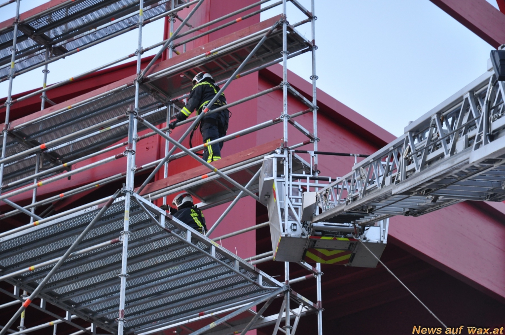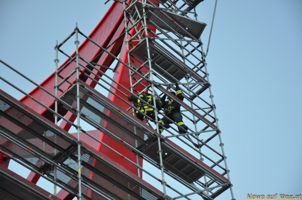 Auch die Höhenrettungsgruppe der Feuerwehr Wiener Neudorf wurde zu einem Einsatz nach Brunn am Gebirge alarmiert. Bei einem Baugerüst hatten sich in über 20 Meter Höhe mehrere Elemente gelöst und drohten auf die B17 zu stürzen.