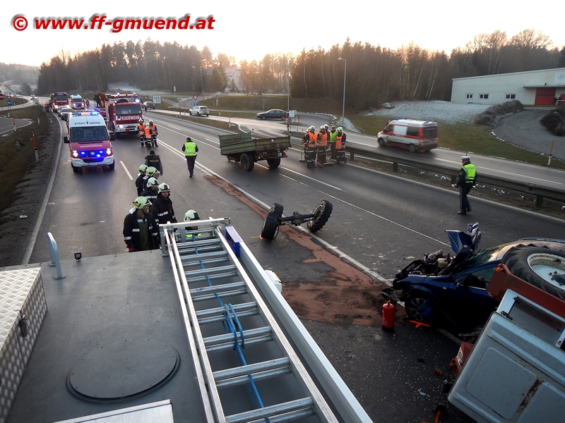 Die Freiwillige Feuerwehr der Stadt Gmünd wurde am 07. Dezember 2016 um 15.28 Uhr von der Leitstelle Florian Nö. zu einem schweren Verkehrsunfall auf der LB41 bei Hoheneich alarmiert. Die Zusatzinformationen lauteten "eingeklemmte Person, VU mit Traktor und PKW, mehrere verletzte Personen" ! 19 Mitglieder rückten innerhalb weniger Minuten mit VORAUS, RÜST, TANK 2, KRAN und LOGISTIK Gmünd zum angegbenen Einsatzort aus.