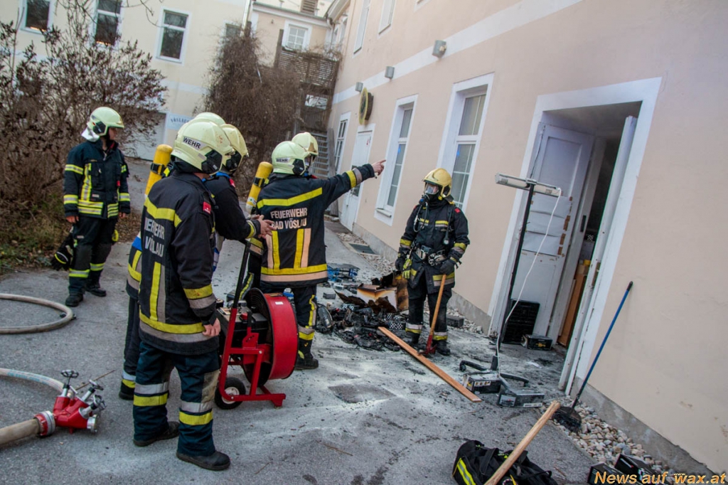Da sich das Feuerwehrhaus Bad Vöslau ganz in der Nähe des Einsatzortes befindet, trafen die ersten Einsatzkräfte nach nur wenigen Minuten an der Einsatzstelle ein. Umgehend lies der Feuerwehreinsatzleiter, nach Erkundung der Lage, eine Löschleitung unter Atemschutz zur Innenbrandbekämpfung vornehmen. Bis zum Eintreffen der ebenfalls alarmierten Rettungskräfte wurde die verletzte Person von den Feuerwehreinsatzkräften versorgt.