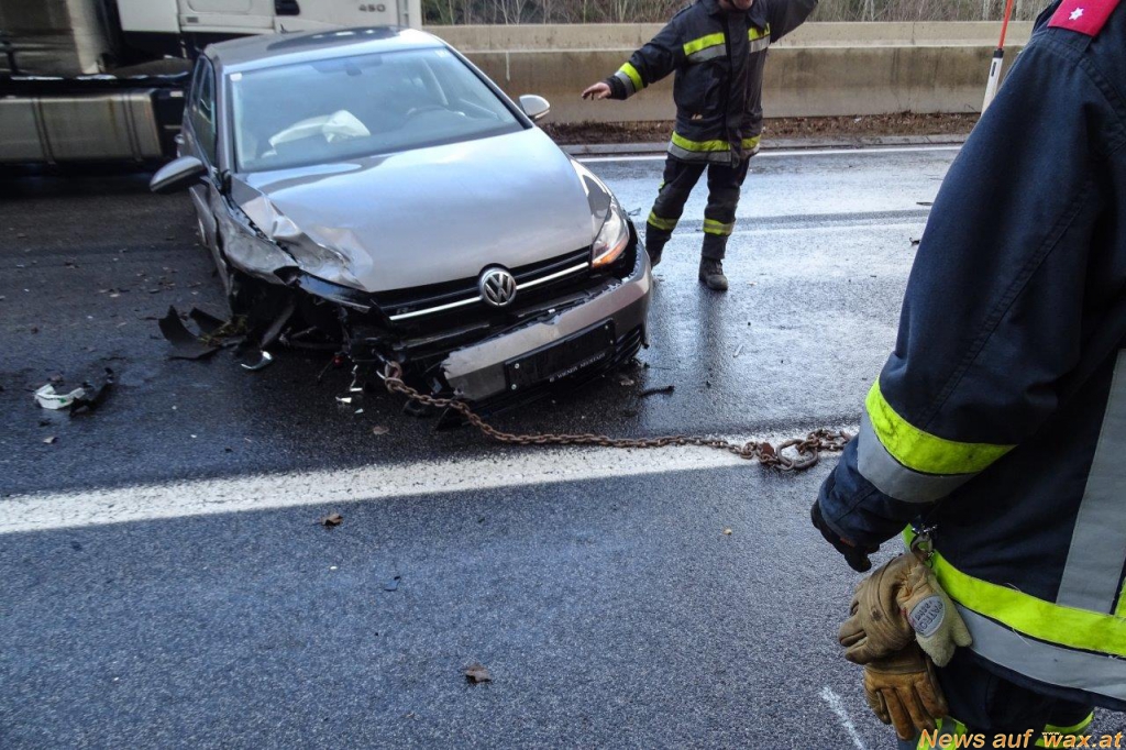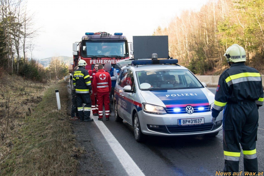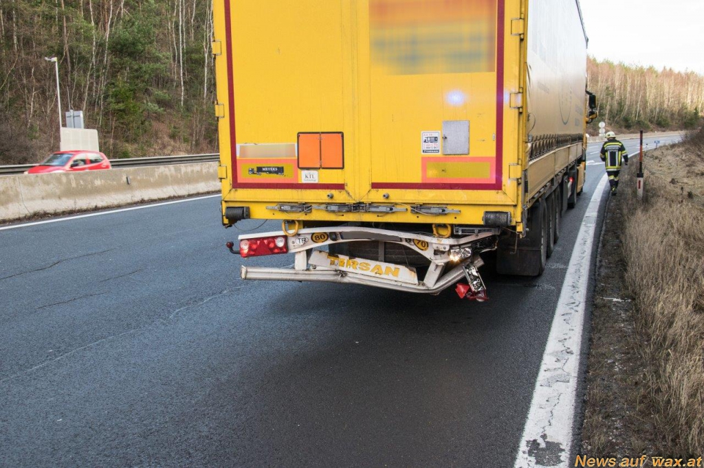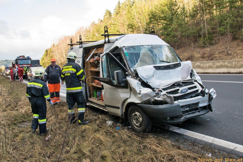 Fast zeitgleich ereignete sich auf der A2 im Wechselabschnitt ein zweiter schwerer Verkehrsunfall. In Fahrtrichtung Graz fuhr der Lenker eines Kleintransporters aus noch unbekannter Ursache zwischen Edlitz und Krumbach auf einen Sattelschlepper auf. Sowohl der Lenker als auch sein Beifahrer erlitten Verletzungen unbestimmten Grades und wurden vom RK Aspang ins Krankenhaus gebracht. Der LKW Lenker blieb unverletzt. Nach der Abischerung durch die Autobahnpolizei und die Asfinag wurde die Bergung des schwer beschädigten Kleintransporters von der FF Aspang durchgeführt.