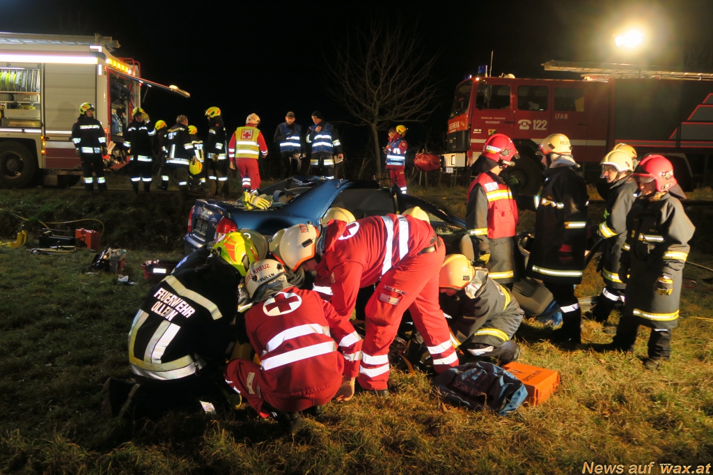 69 Mitglieder der Feuerwehren Ollern, Sieghartskirchen und Wilfersdorf sowie des Roten Kreuz Sieghartskirchen und Tulln übten am vergangen Montagabend gemeinsam den Ernstfall. Angenommen wurden ein Verkehrsunfall auf der Riederbergstraße. Zwei Fahrzeuge kollidierten frontal im Kurvenbereich, die beiden Lenker und ein Beifahrer waren in den Wracks eingeklemmt. Ein weiteres Fahrzeug konnte noch rechtzeitig ausweichen und überschlug sich. Der Lenker wurde unter seinem PKW eingeklemmt und die Beifahrerin lag verletzt in einer angrenzenden Wiese.