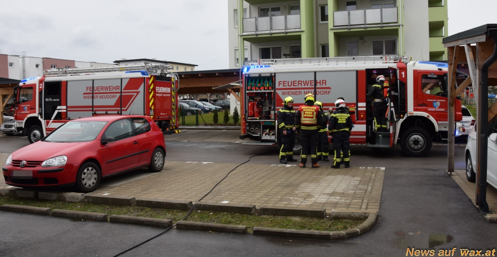 Wenige Minuten später traf die Freiwillige Feuerwehr Wiener Neudorf mit mehreren Tanklöschfahrzeugen und der Drehleiter am Einsatzort ein. Im Zuge der Erkundung des verrauchten Bereiches durch einen Atemschutztrupp konnte in einem Kellerabteil eine verkohlte Handlampe entdeckt werden.