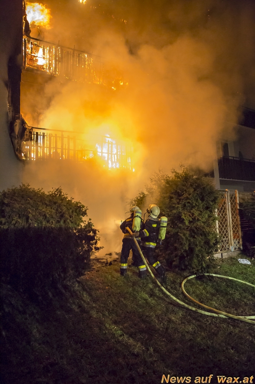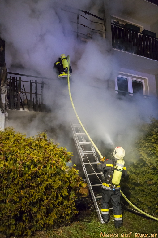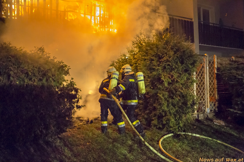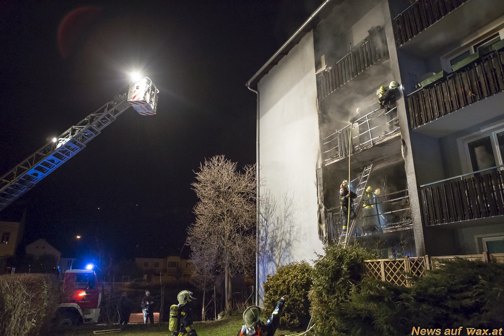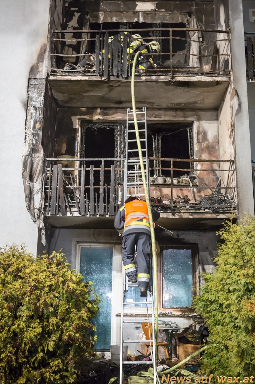 "Beim Eintreffen der ersten Einsatzkräfte standen alle Balkone vom Erdgeschoss bis in den dritten Stock in Vollbrand, der Brand breitete sich teilweise auch auf die angrenzenden Fassadenteile aus", berichtet der erste Fahrzeugkommandant. Die Wohnungen im ersten und zweiten Stock waren am schwersten durch die Brand- und Rauchausbreitung betroffen. Aufgrund sehr kurzer Rettungswege in diesem Haus (jede Wohnungstür führt direkt ins Freie in offene Laubengänge) konnten die Bewohner rasch flüchten. Die Einsatzkräfte durchsuchten das Wohnhaus wie das Nachbarhaus und begleiteten die Personen zum Sammelplatz. Eine Bewohnerin wurde zur Kontrolle ins Universitätsklinikum Krems gebracht.