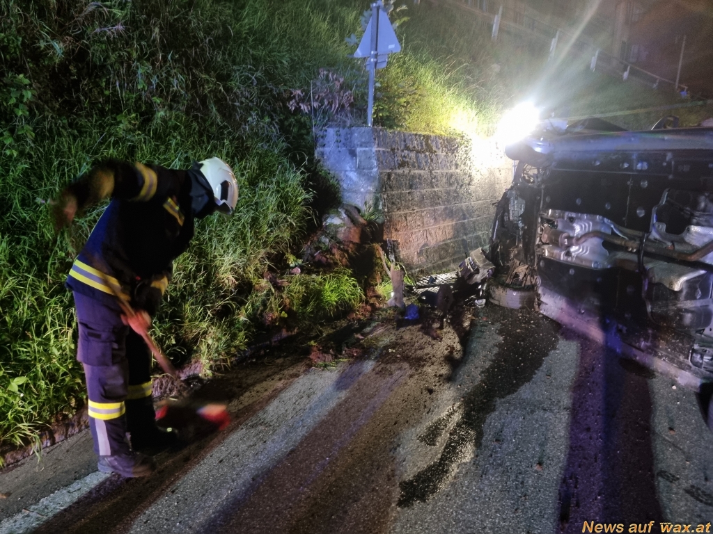 Am Einsatzort angekommen konnte zum Glück schnell Entwarnung gegeben werden. Entgegen der ersten Meldung „Auto überschlagen, Lenker noch im Fahrzeug“ hatte der Insasse das völlig beschädigte und auf der Seite liegende Fahrzeug bereits selbstständig verlassen.