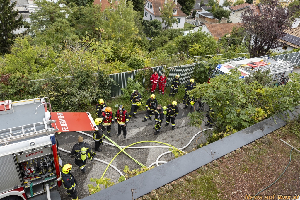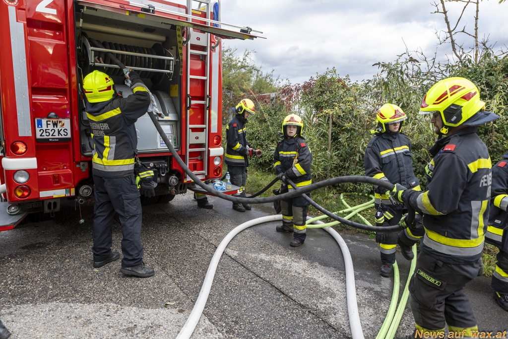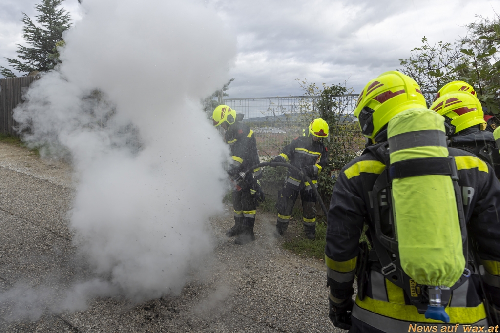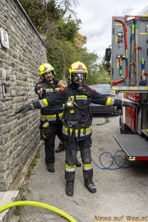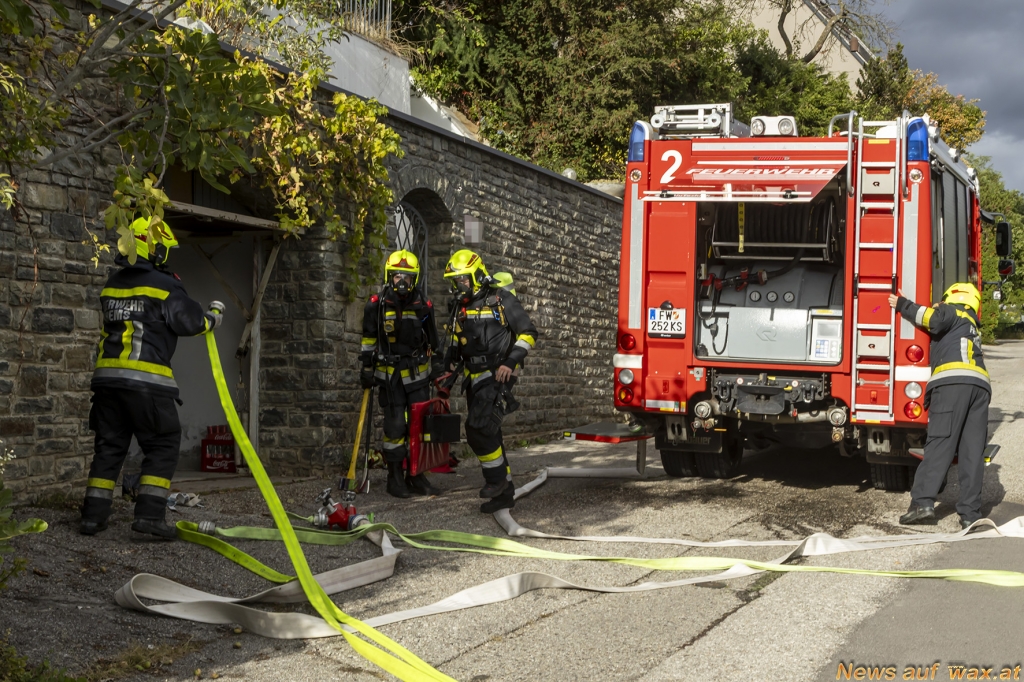 Rasch rückten mehrere Fahrzeuge der beiden Feuerwachen aus. Bereits während der Anfahrt versuchter der Hausbewohner selbst das Feuer mittels Pulverlöscher abzulöschen. Beim Eintreffen der Feuerwehr am Einsatzort wies der Anrufer die Einsatzkräfte ein. Während der Erkundung durch den Fahrzeugkommandanten baute die Mannschaft eine Löschleitung auf, um sofort Erstmaßnahmen durchführen zu können. Unter Atemschutz und mit einer Löschleitung ging anschließend der erste Trupp in den Keller vor. Dort konnte eine brennende Aschenlade eines Pelletsofens vorgefunden werden. Nachdem diese ins Freie gebracht und abgelöscht worden war, konnte rasch „Brand aus“ gegeben werden. Mittels Druckbelüfter wurde der verrauchte Bereich rauchfrei gemacht.