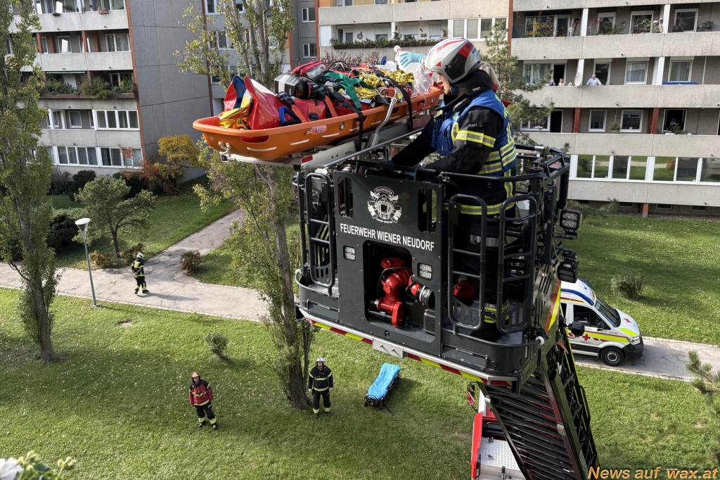 In bewährter Zusammenarbeit zwischen Rettungsdienst und Feuerwehr konnte die Person mithilfe der Drehleiter rasch und sicher ins Freie gebracht und anschließend in ein Krankenhaus transportiert werden. Die Freiwillige Feuerwehr Wiener Neudorf stand mit zwei Fahrzeugen und elf Mitgliedern im Einsatz.