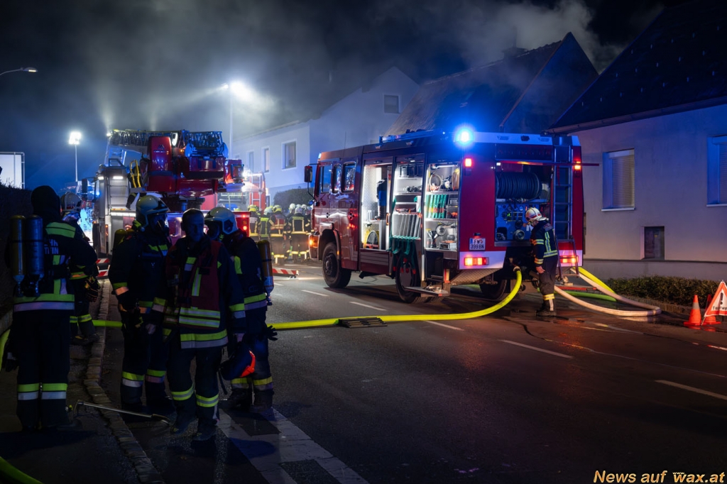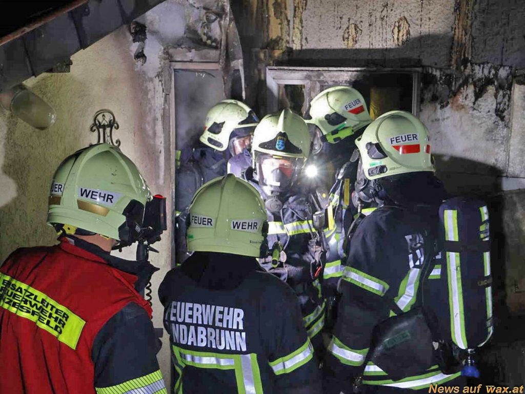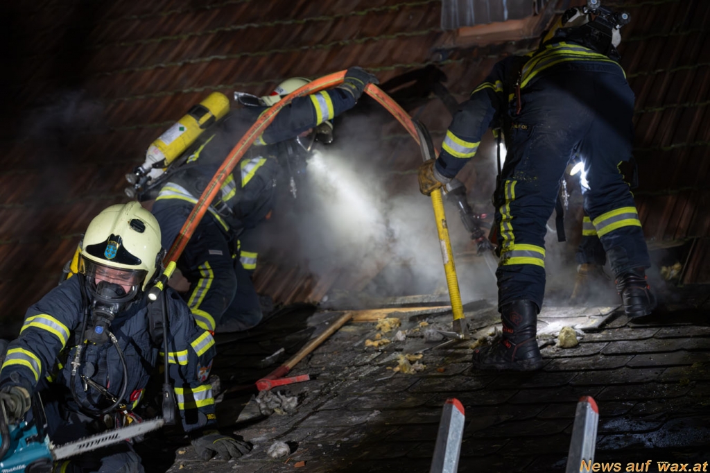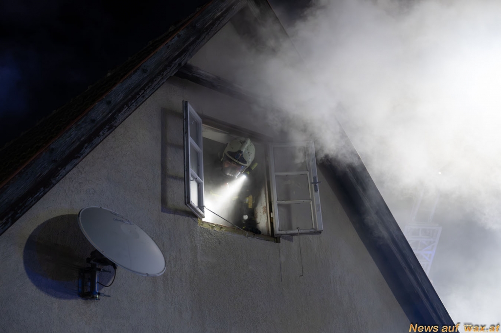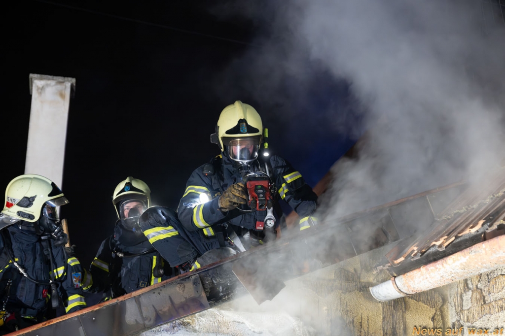 Kurz darauf trafen die ersten Tanklöschfahrzeuge am Einsatzort ein. Einsatzleiter Feuerwehrkommandant Michael Hebesberger (FF Enzesfeld) erkundete die Lage. Glücklicherweise befand sich keine weitere Person im Gebäude. Die Flammen hatten bereits aus dem hofseitigen Vorhaus auf das Dach übergegriffen. Umgehend begannen Atemschutztrupps mit dem Außenangriff, um eine weitere Ausbreitung zu verhindern. Mit dem Eintreffen weiterer Löschmannschaften konnte der Brand rasch eingedämmt und anschließend auch im Innenangriff bekämpft werden.